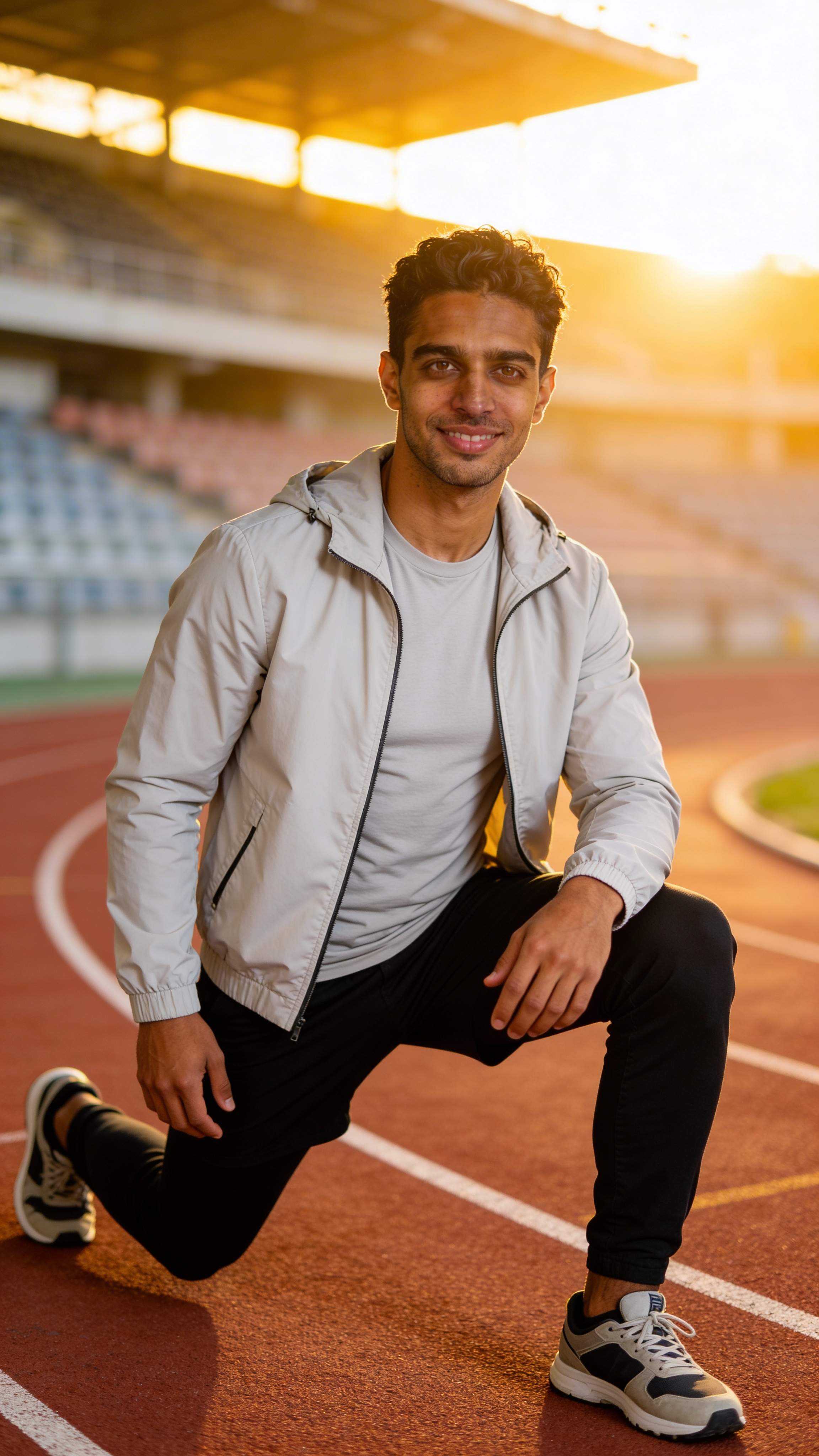 Single photograph of exactly the same person as the reference image(s), consistent identity realistic photograph, male person, 32 years old, dark-brown eyes, black hair color, textured hair style, caramel skin Hair color must stay black. Keep hairstyle consistent (textured). Do not change defining physical features. No wigs. No hats. Face unobscured. Full-body shot. Outdoor running track at sunrise with golden rim light, soft haze, stadium seats blurred in background. Outfit: lightweight windbreaker over performance set. Pose: mid-warmup stretch with one knee up, friendly smile, looking toward camera. Athletic lifestyle branding style, crisp and natural; no captions, no writing anywhere; no text, no watermarks, no logos, no overlays