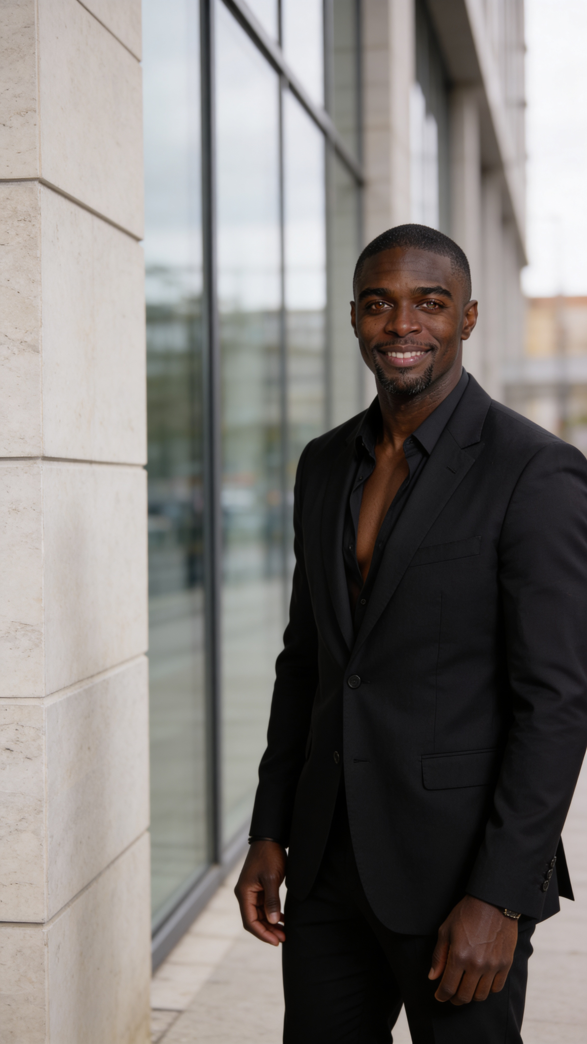 Single photograph of exactly the same person as the reference image(s), consistent identity realistic photograph, male person, 39 years old, dark-brown eyes, black hair color, classic hair style, ebony skin, Very tiny chest (flat upper body) covered with clothing Hair color must stay black. Keep hairstyle consistent (classic). Do not change defining physical features. No wigs. No hats. Face unobscured. Environmental shot. Outdoor business-district portrait near a plain stone wall or modern glass facade, background softly blurred to remove distractions. Subject is three-quarter framing, standing tall with relaxed arms, confident approachable smile. Outfit: dark suit jacket with open-collar shirt. Soft overcast daylight for even skin tones and professional CV photo for job applications vibe; no text, no watermarks, no logos, no overlays.