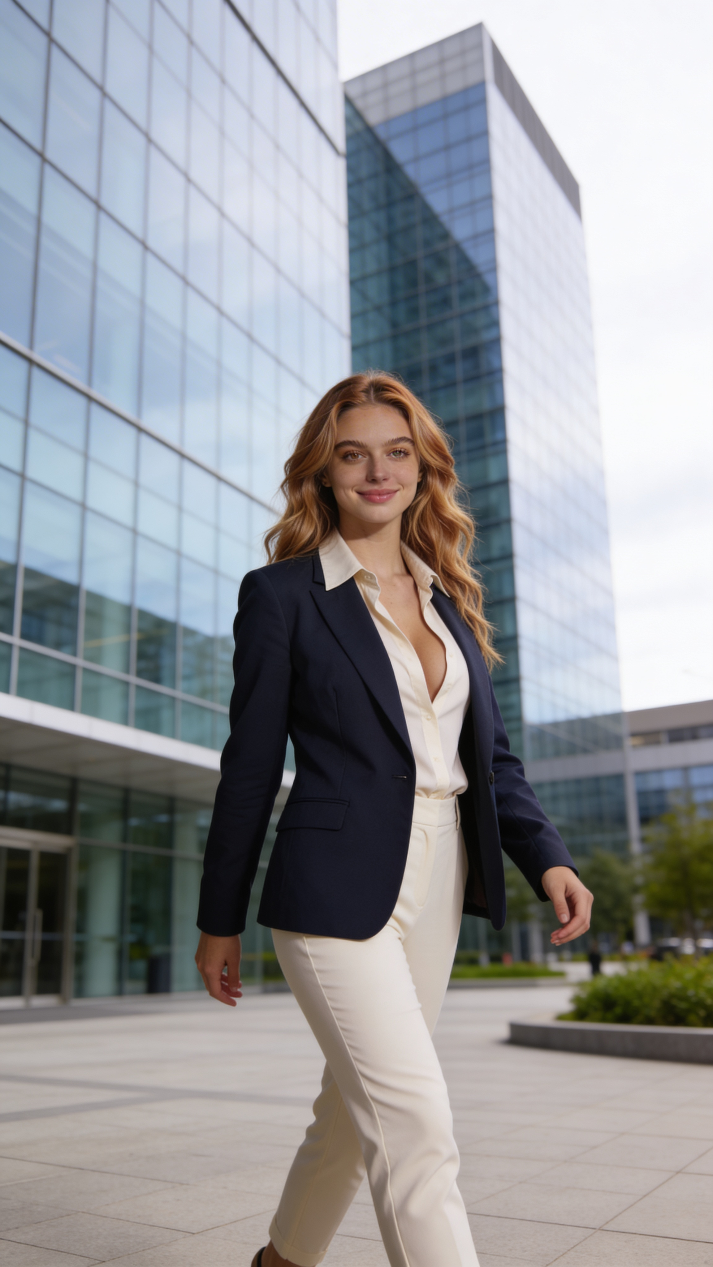 Single photograph of exactly the same person as the reference image(s), consistent identity realistic photograph, female person, 23 years old, light-brown eyes, light-brown hair color, wavy hair style, cream skin Hair color must stay light-brown. Keep hairstyle consistent (wavy). Do not change defining physical features. No wigs. No hats. Face unobscured. Full-body shot. Outdoor corporate campus scene: modern glass building and greenery blurred, 3/4 body portrait with subject walking slowly and turning toward camera, confident friendly smile. Outfit: navy blazer, open-collar shirt. Lighting: bright overcast for soft shadows and clean skin tones, no captions or writing; no text, no watermarks, no logos, no overlays