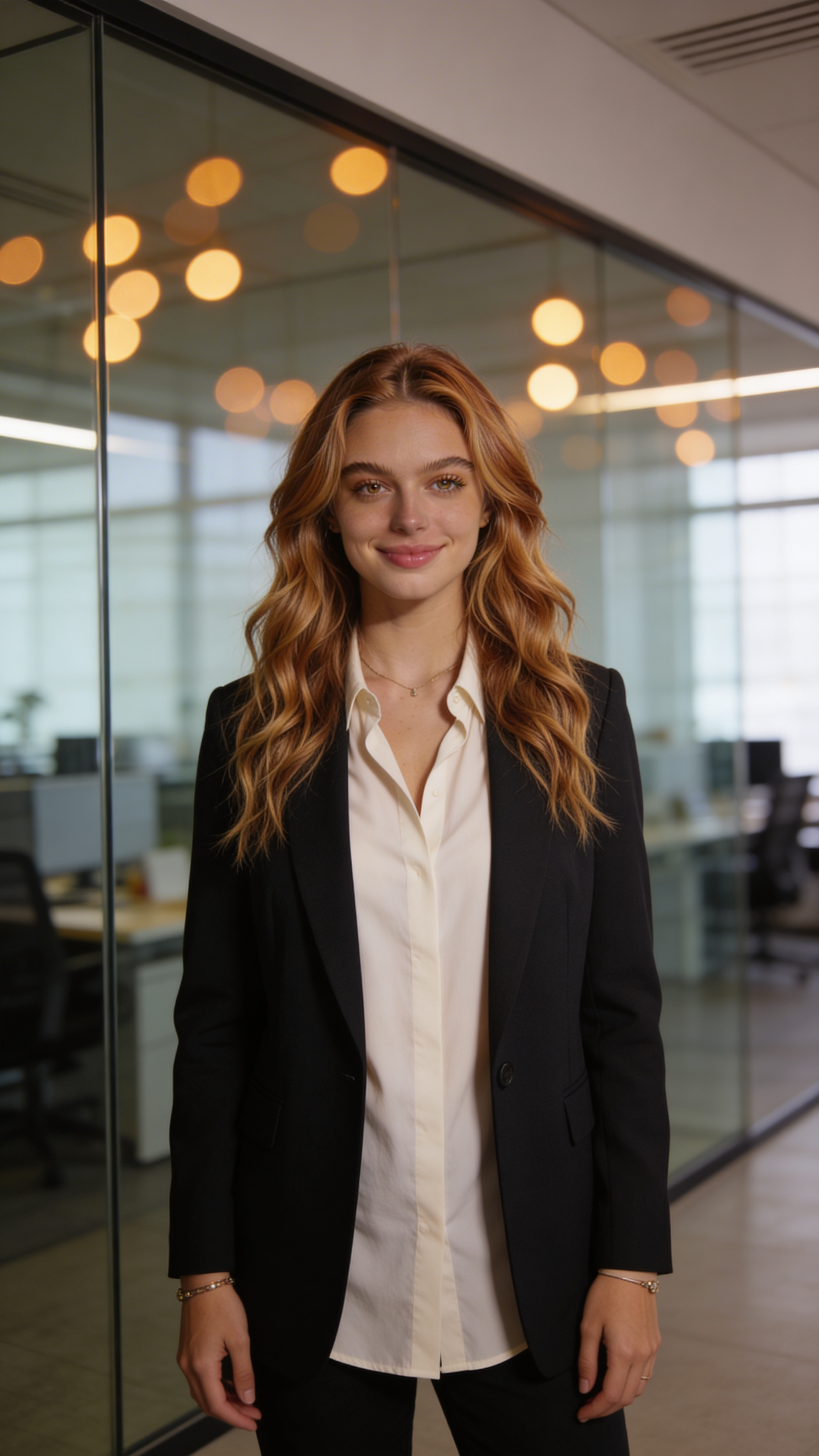 Single photograph of exactly the same person as the reference image(s), consistent identity realistic photograph, female person, 23 years old, light-brown eyes, light-brown hair color, wavy hair style, cream skin Hair color must stay light-brown. Keep hairstyle consistent (wavy). Do not change defining physical features. No wigs. No hats. Face unobscured. Half-body shot. Same character professional profile photo look in a modern coworking space, shoulders-up to half-body framing, posture upright, calm smile. Outfit: crisp blouse with blazer, subtle jewelry. Background: glass walls and warm bokeh lights. Lighting: balanced indoor light with soft key and natural fill, realistic skin texture. Clean, tasteful portrait for profiles; no writing; no text, no watermarks, no logos, no overlays
