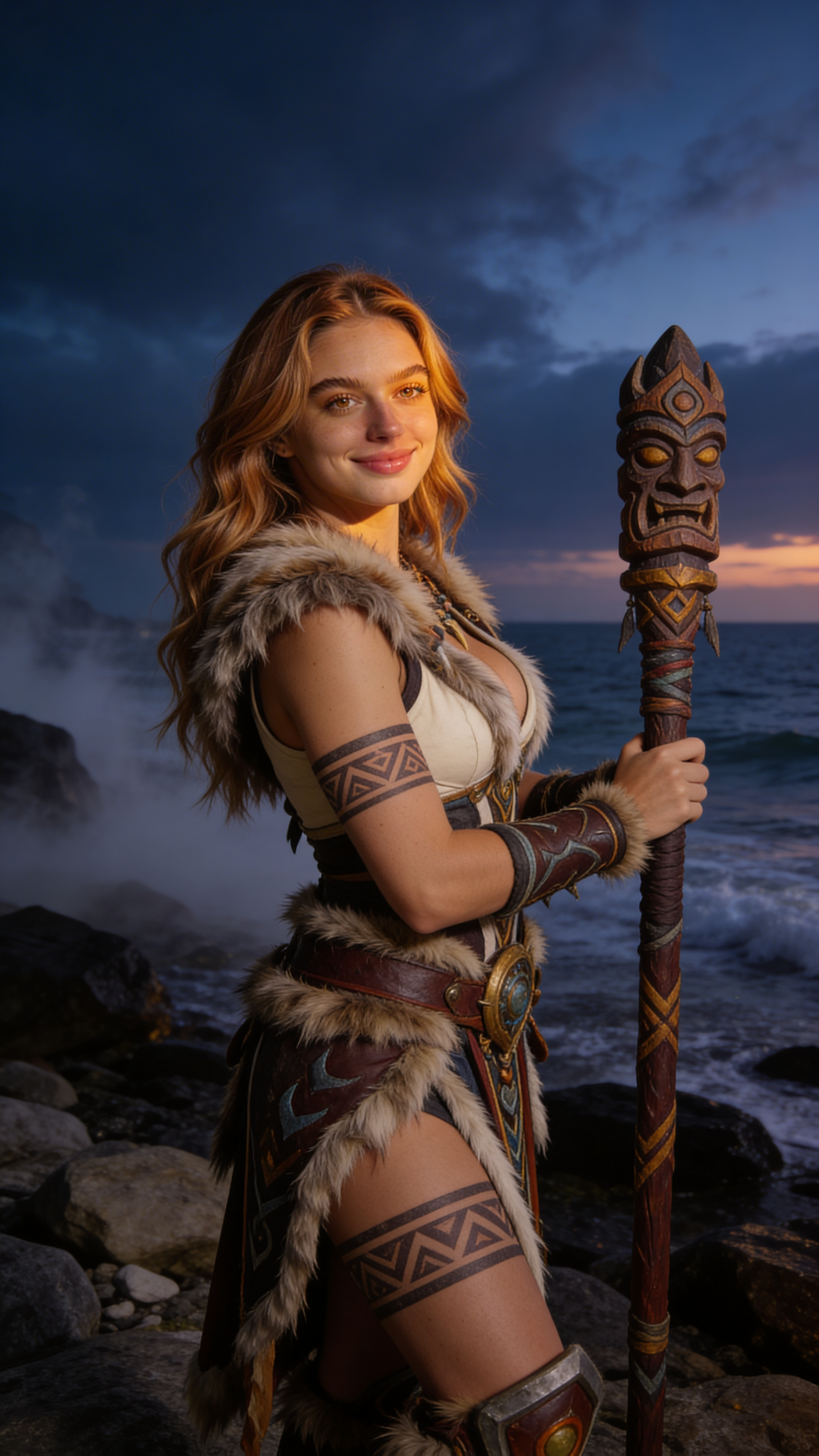 Single photograph of exactly the same person as the reference image(s), consistent identity realistic photograph, female person, 23 years old, light-brown eyes, light-brown hair color, wavy hair style, cream skin Hair color must stay light-brown. Keep hairstyle consistent (wavy). Do not change defining physical features. No wigs. No hats. Face unobscured. Environmental shot. Rocky shoreline at dusk for a World of Warcraft-inspired shaman cosplay: ocean mist, cool ambient tones, warm key on face. Outfit: fur trim, tribal patterns, totem prop. Pose: 3/4 body, slight turn, friendly grin, one hand gripping the totem. Dramatic sky, realistic textures, no captions, no writing, no text, no watermarks, no logos, no overlays