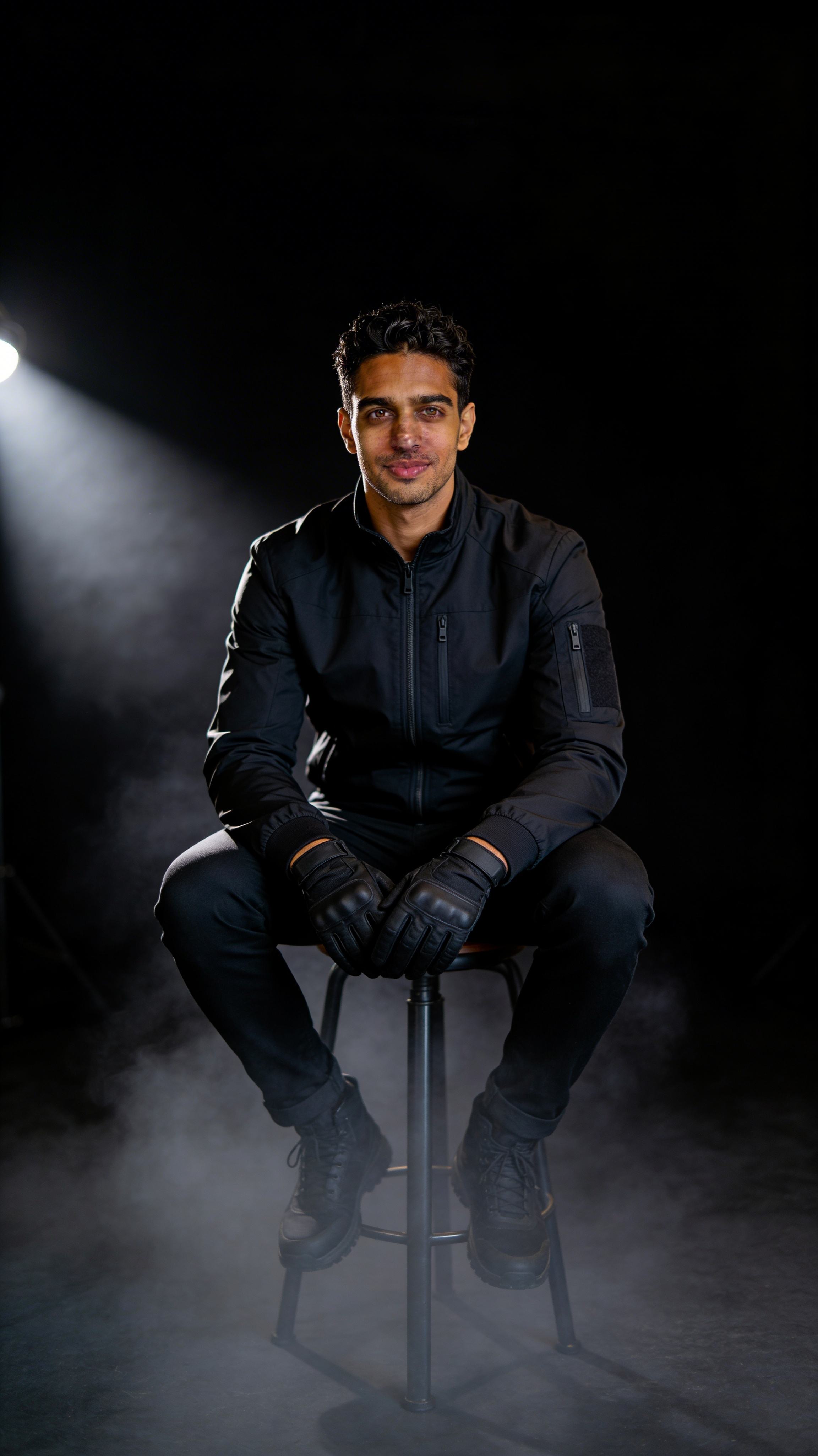 Single photograph of exactly the same person as the reference image(s), consistent identity realistic photograph, male person, 32 years old, dark-brown eyes, black hair color, textured hair style, caramel skin Hair color must stay black. Keep hairstyle consistent (textured). Do not change defining physical features. No wigs. No hats. Face unobscured. Half-body shot. Cinematic low-key studio scene for a stealth-themed Fortnite cosplay photoshoot: black backdrop, single side key light, subtle fog, strong contrast. The same character wears a matte-black stealth jacket cosplay with gloves, sitting on a stool with elbows on knees, calm confident look. Generate multiple seated poses and expressions with perfect same-face consistency. No captions, no writing, no text, no watermarks, no logos, no overlays