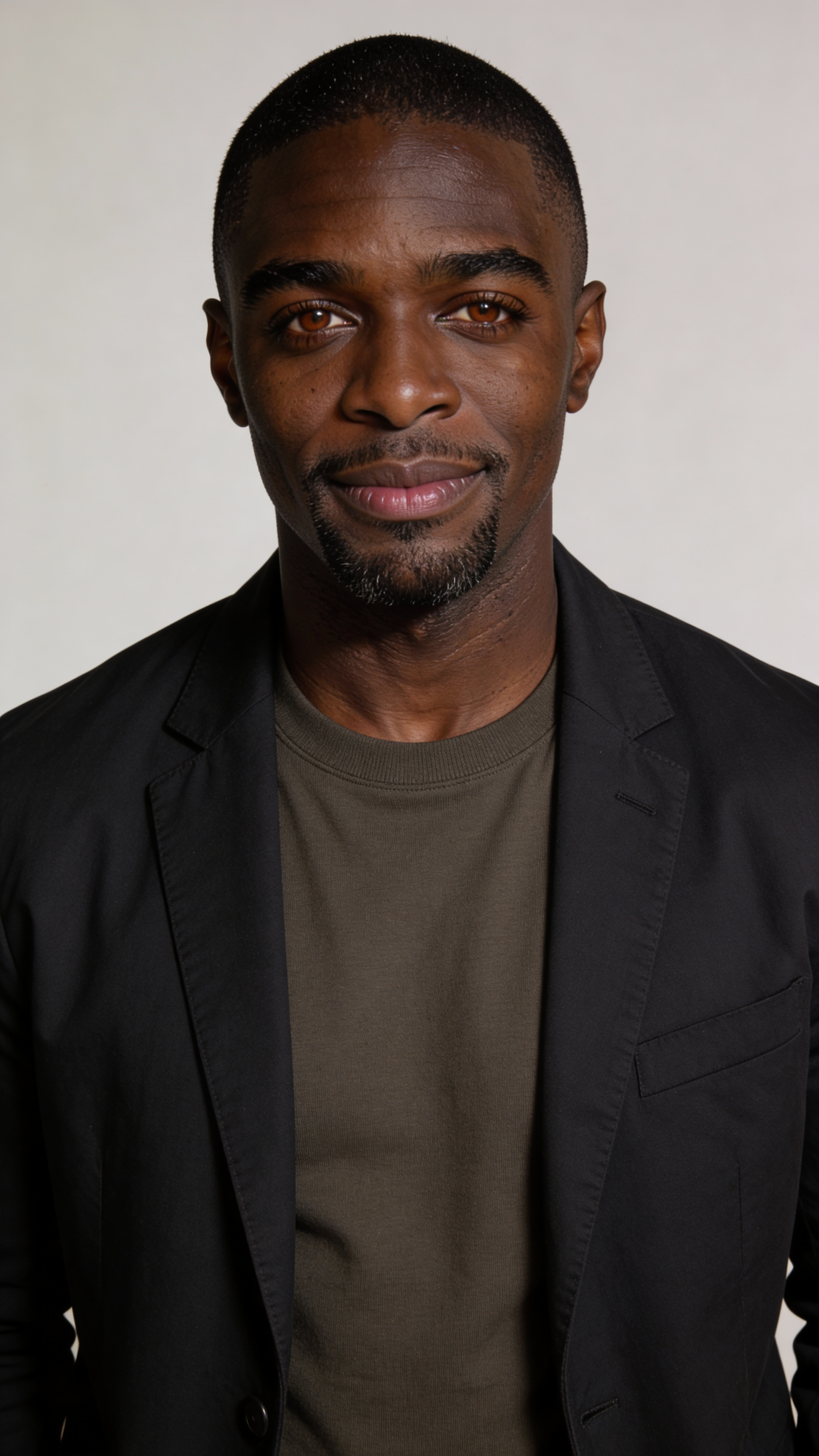 Single photograph of exactly the same person as the reference image(s), consistent identity realistic photograph, male person, 39 years old, dark-brown eyes, black hair color, classic hair style, ebony skin, Very tiny chest (flat upper body) covered with clothing Hair color must stay black. Keep hairstyle consistent (classic). Do not change defining physical features. No wigs. No hats. Face unobscured. Headshot shot. A realistic studio headshot photoshoot with a soft gray backdrop and flattering softbox lighting. The same character faces camera with a subtle confident smile, natural skin texture, minimal retouching. Outfit: casual blazer over crewneck. Crisp, professional look for a strong first photo on dating apps. no text, no watermarks, no logos, no overlays, no captions, no writing. no text, no watermarks, no logos, no overlays
