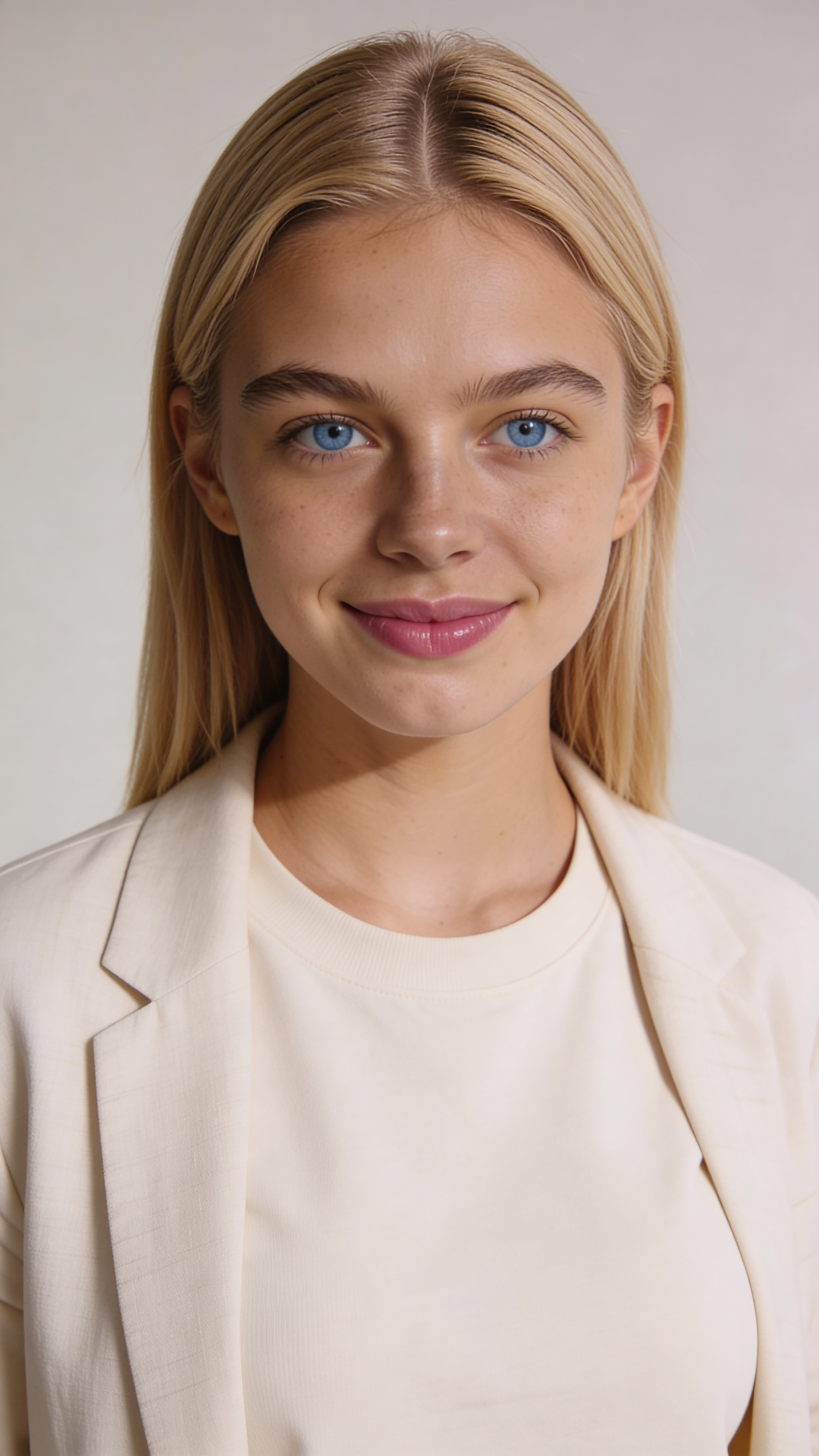 Single photograph of exactly the same person as the reference image(s), consistent identity realistic photograph, female person, 24 years old, light-blue eyes, blonde hair color, straight hair style, ivory skin, medium natural breasts (Cup size D) covered with clothing Hair color must stay blonde. Keep hairstyle consistent (straight). Do not change defining physical features. No wigs. No hats. Face unobscured. Headshot shot. A realistic studio headshot photoshoot with a soft gray backdrop and flattering softbox lighting. The same character faces camera with a subtle confident smile, natural skin texture, minimal retouching. Outfit: casual blazer over crewneck. Crisp, professional look for a strong first photo on dating apps. no text, no watermarks, no logos, no overlays, no captions, no writing. no text, no watermarks, no logos, no overlays