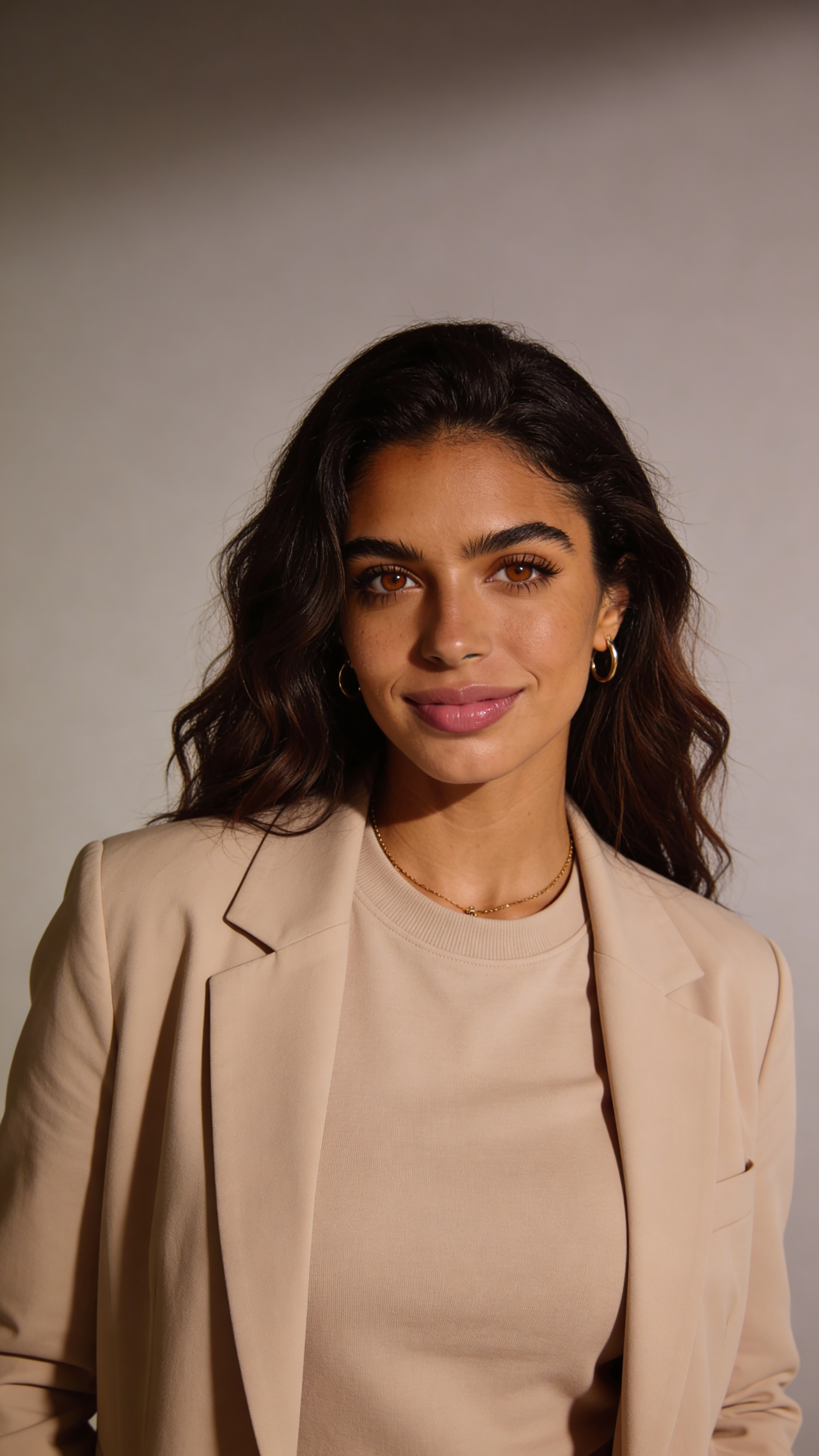 Single photograph of exactly the same person as the reference image(s), consistent identity realistic photograph, female person, 27 years old, brown eyes, dark-brown hair color, wavy hair style, olive skin, medium natural breasts (Cup size D) covered with clothing Hair color must stay dark-brown. Keep hairstyle consistent (wavy). Do not change defining physical features. No wigs. No hats. Face unobscured. Headshot shot. A realistic studio headshot photoshoot with a soft gray backdrop and flattering softbox lighting. The same character faces camera with a subtle confident smile, natural skin texture, minimal retouching. Outfit: casual blazer over crewneck. Crisp, professional look for a strong first photo on dating apps. no text, no watermarks, no logos, no overlays, no captions, no writing. no text, no watermarks, no logos, no overlays