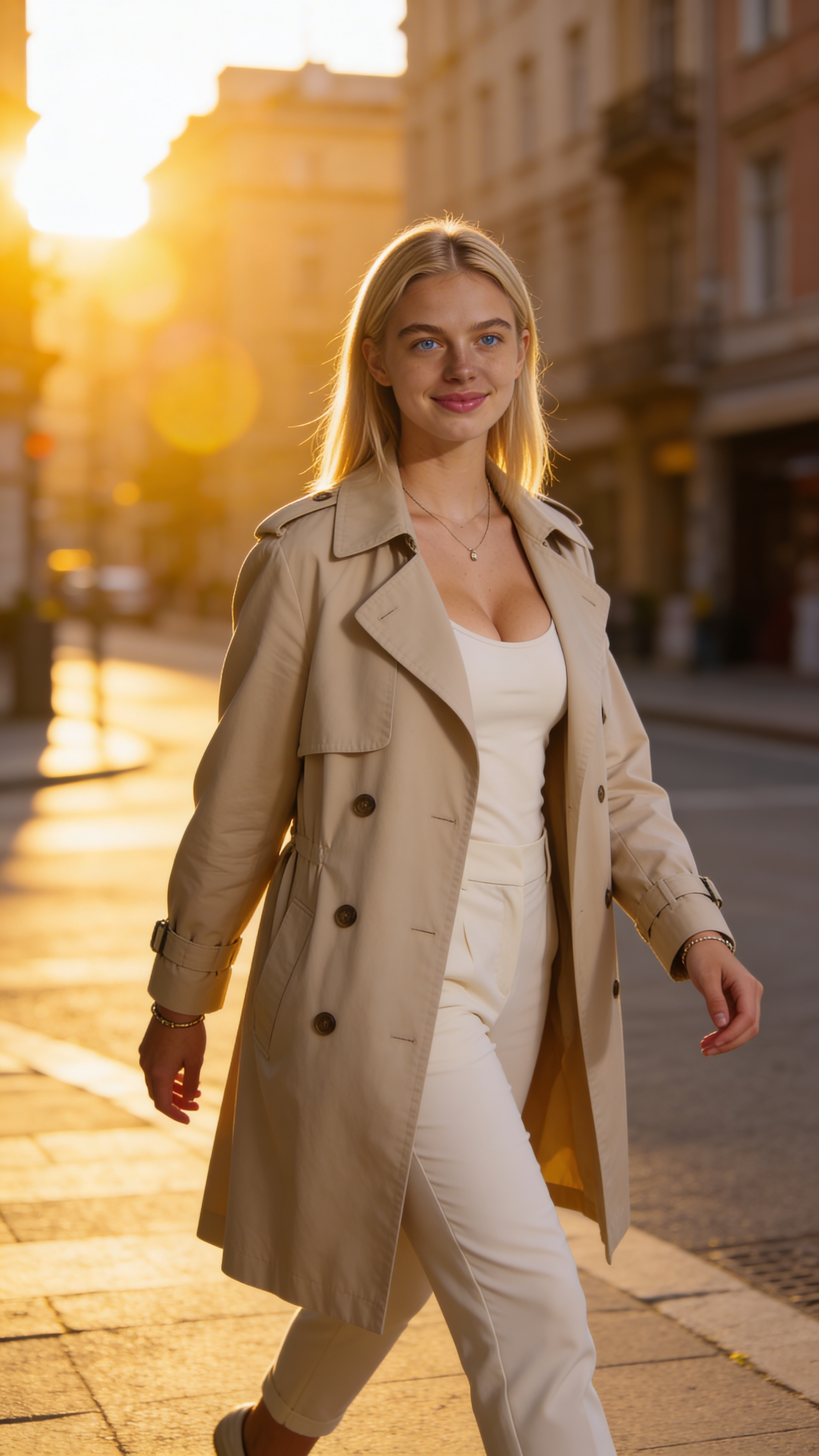 Single photograph of exactly the same person as the reference image(s), consistent identity realistic photograph, female person, 24 years old, light-blue eyes, blonde hair color, straight hair style, ivory skin Hair color must stay blonde. Keep hairstyle consistent (straight). Do not change defining physical features. No wigs. No hats. Face unobscured. Environmental shot. Same character outdoors at golden hour in an urban street setting, three-quarter body, walking mid-stride while looking at camera with a confident smile. Outfit: trench coat over monochrome outfit, simple accessories. Background: city buildings softly blurred, warm sun flare controlled. Lighting: golden-hour with gentle fill for flattering glow. Keep identity consistent, no writing; no text, no watermarks, no logos, no overlays