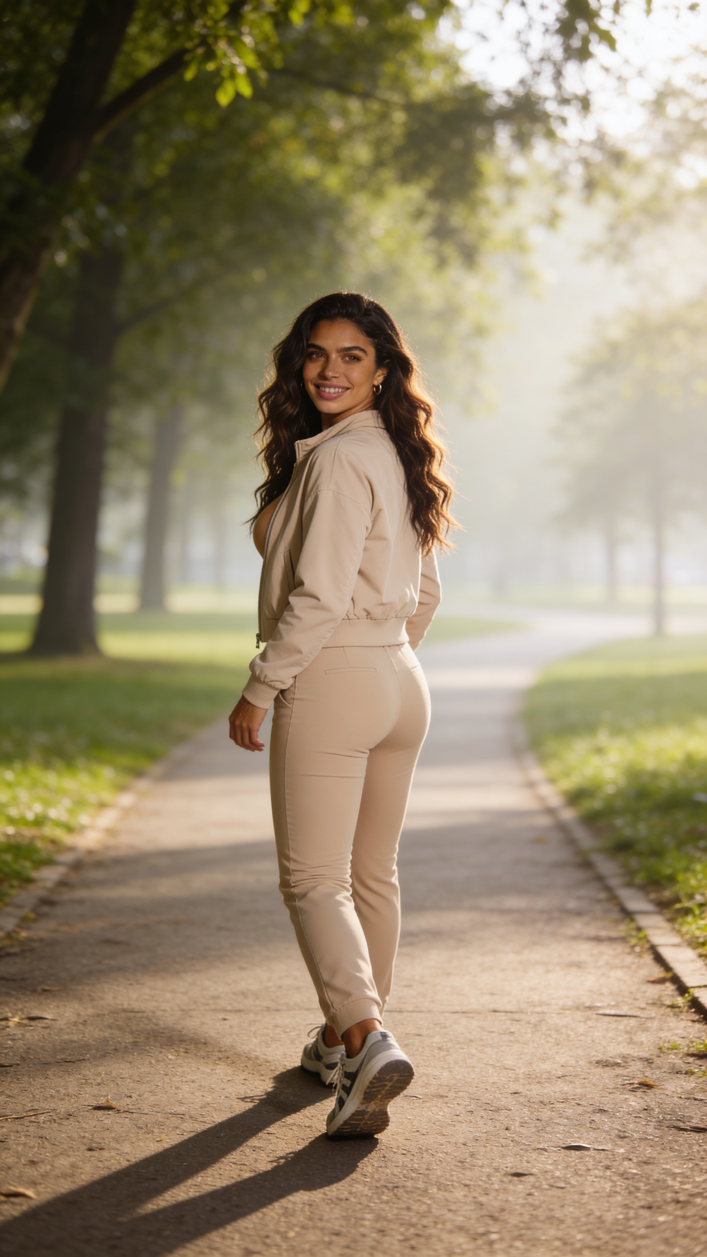 Single photograph of exactly the same person as the reference image(s), consistent identity realistic photograph, female person, 27 years old, brown eyes, dark-brown hair color, wavy hair style, olive skin, medium natural breasts (Cup size D) covered with clothing Hair color must stay dark-brown. Keep hairstyle consistent (wavy). Do not change defining physical features. No wigs. No hats. Face unobscured. Full-body shot. A realistic park photoshoot on a tree-lined path in soft morning light. The same character walks slowly toward the camera, looking back with a genuine smile. Outfit: simple athleisure jacket and sneakers. Background greenery blurred, airy tones, candid movement feel perfect for natural dating profile photos. no text, no watermarks, no logos, no overlays, no captions, no writing. no text, no watermarks, no logos, no overlays
