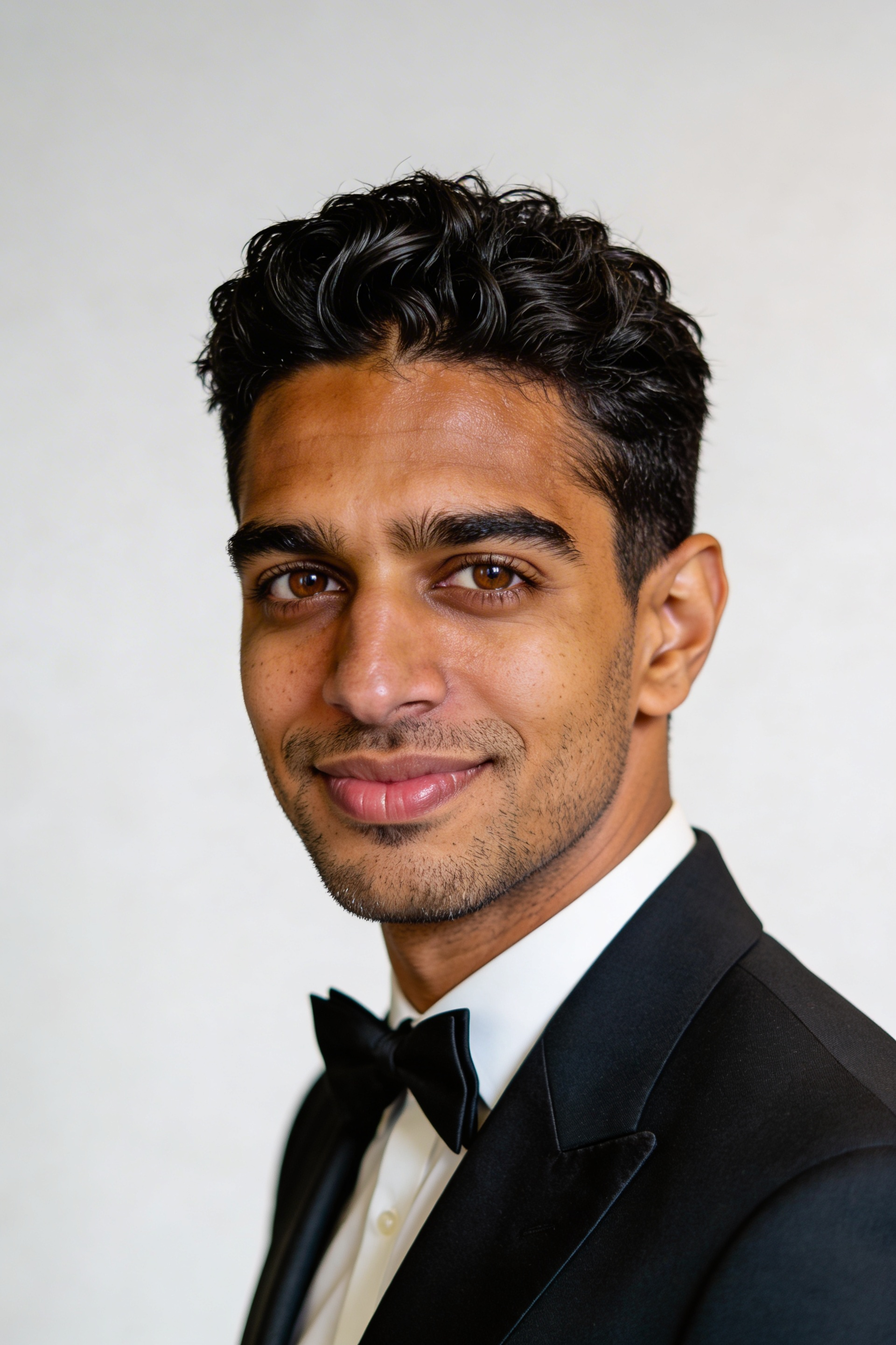 Single photograph of exactly the same person as the reference image(s), consistent identity realistic photograph, male person, 32 years old, dark-brown eyes, black hair color, textured hair style, caramel skin Hair color must stay black. Keep hairstyle consistent (textured). Do not change defining physical features. No wigs. No hats. Face unobscured. Portrait 2:3 aspect ratio. The same Hispanic/Latino man with short black hair and neatly trimmed beard wears a black tuxedo, close-up head-and-shoulders framing for a profile-style shot. Expression: calm confident smile, direct eye contact. Clean light gray background, soft even lighting, ideal groom portraits for profile. No captions, no writing; no text, no watermarks, no logos, no overlays