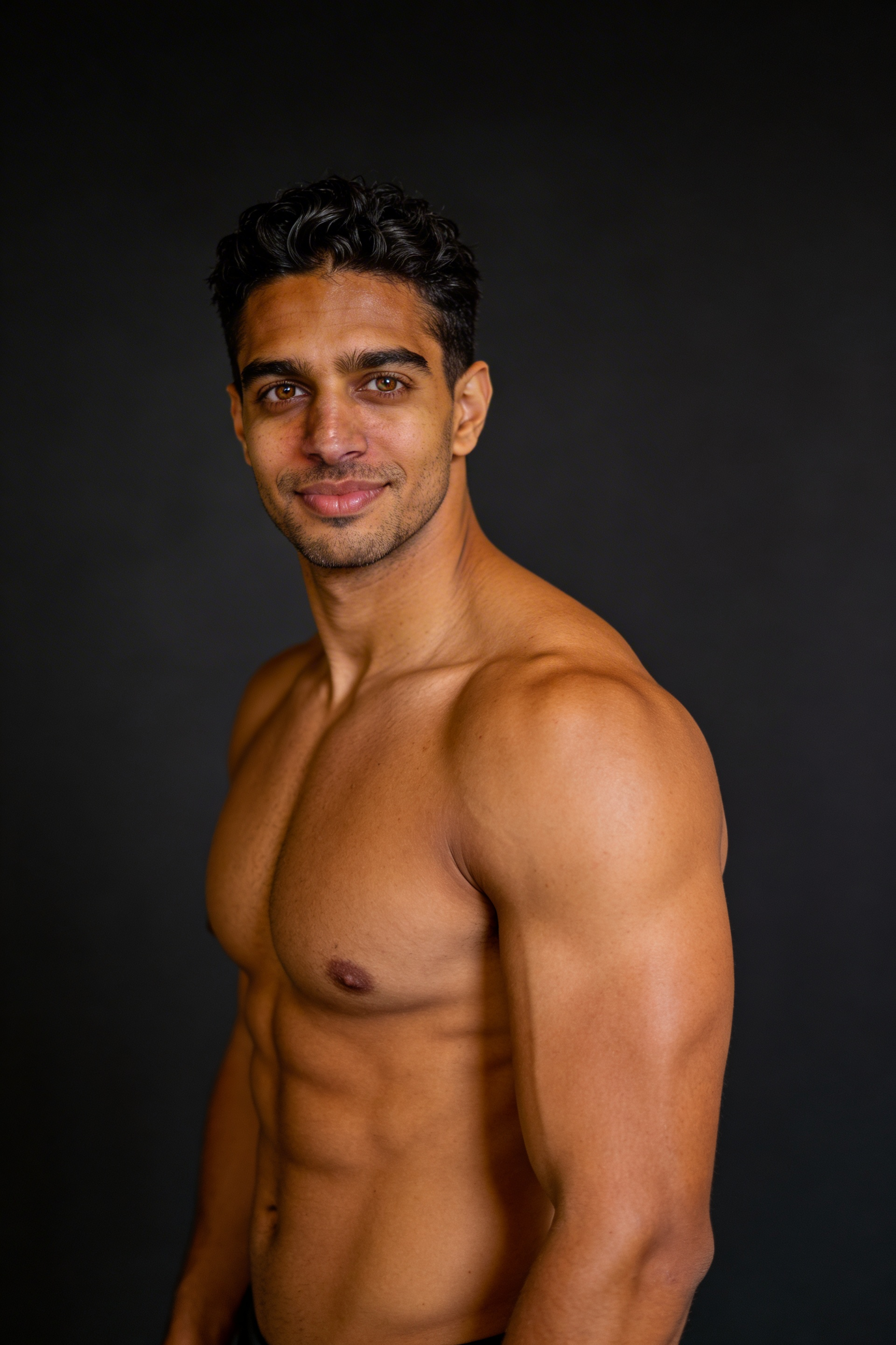 Single photograph of exactly the same person as the reference image(s), consistent identity realistic photograph, male person, 32 years old, dark-brown eyes, black hair color, textured hair style, caramel skin Hair color must stay black. Keep hairstyle consistent (textured). Do not change defining physical features. No wigs. No hats. Face unobscured. Portrait 2:3. The SAME Middle Eastern male bodybuilder with the same short black hair and trimmed beard in a dark studio with charcoal seamless. 3/4 body classic side chest pose, slight smile, dramatic key light and gentle fill for natural skin texture and chest thickness emphasis. No captions, no writing; no text, no watermarks, no logos, no overlays
