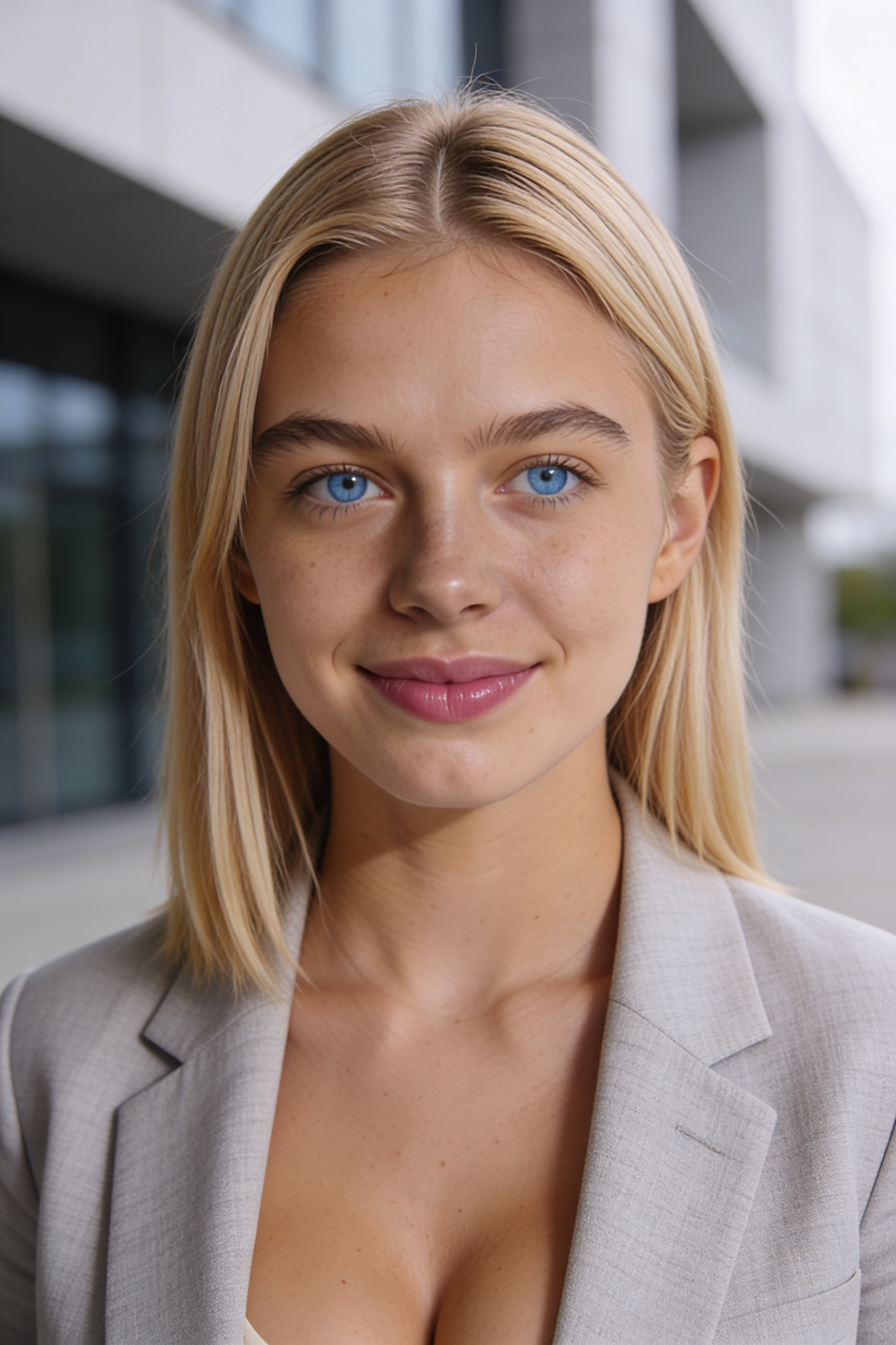 A woman/female person. Square 1:1 outdoor headshot of the same person near clean modern architecture, wearing a light gray blazer, confident approachable expression, soft overcast daylight for even tones, background gently blurred, no text, no watermarks, no logos, no overlays, no captions, no writing