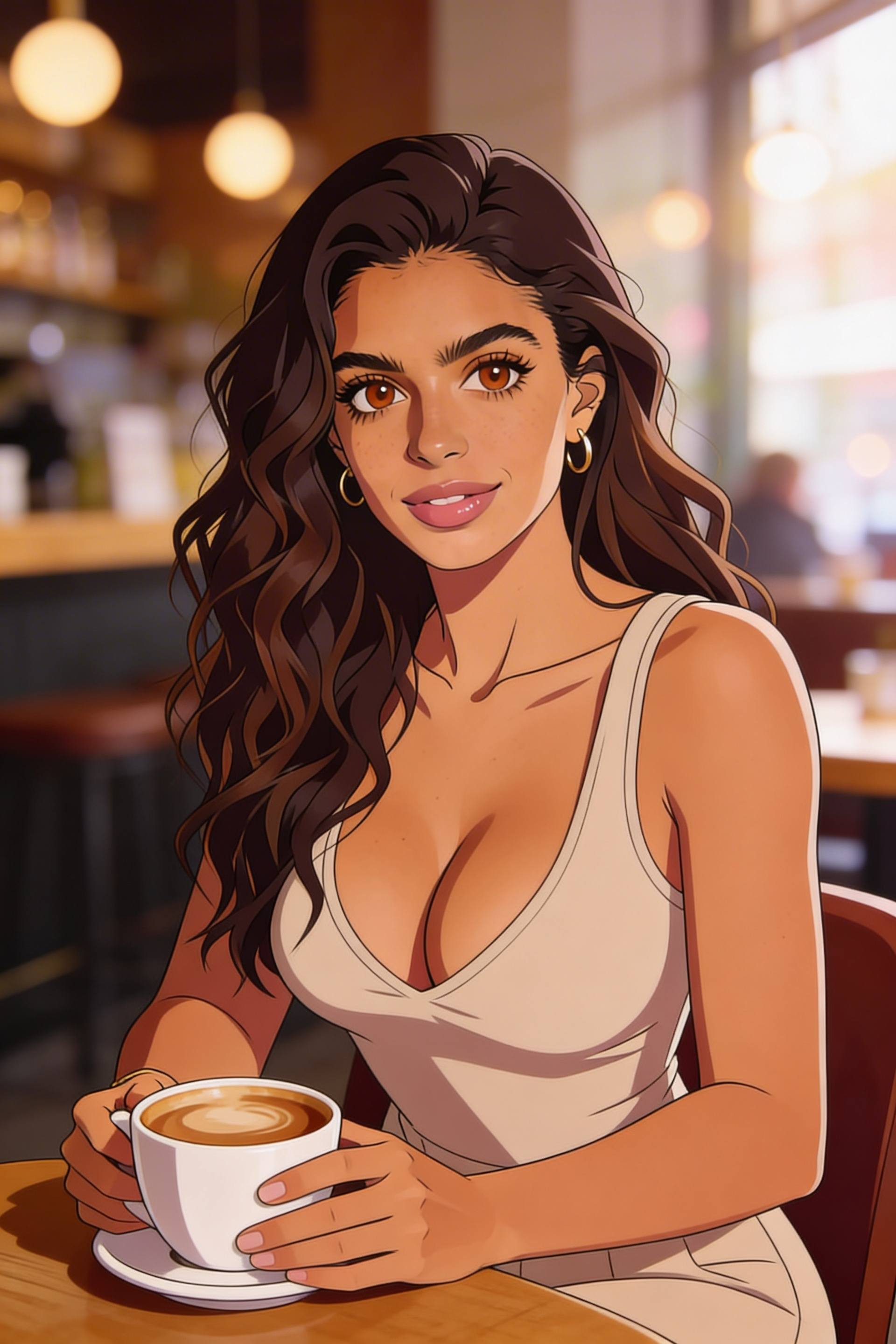 Single photograph of exactly the same person as the reference image(s), consistent identity realistic photograph, female person, 27 years old, brown eyes, dark-brown hair color, wavy hair style, olive skin Hair color must stay dark-brown. Keep hairstyle consistent (wavy). Do not change defining physical features. No wigs. No hats. Face unobscured. Portrait 2:3 anime-style illustration of the SAME Hispanic/Latina woman with unchanged long wavy dark brown hair, seated in a cozy coffee shop holding a cup, gentle smile, half-body framing. Warm indoor lighting, soft background bokeh. Clean anime self portrait style that keeps her facial features identical to other images. No captions, no writing, no text, no watermarks, no logos, no overlays