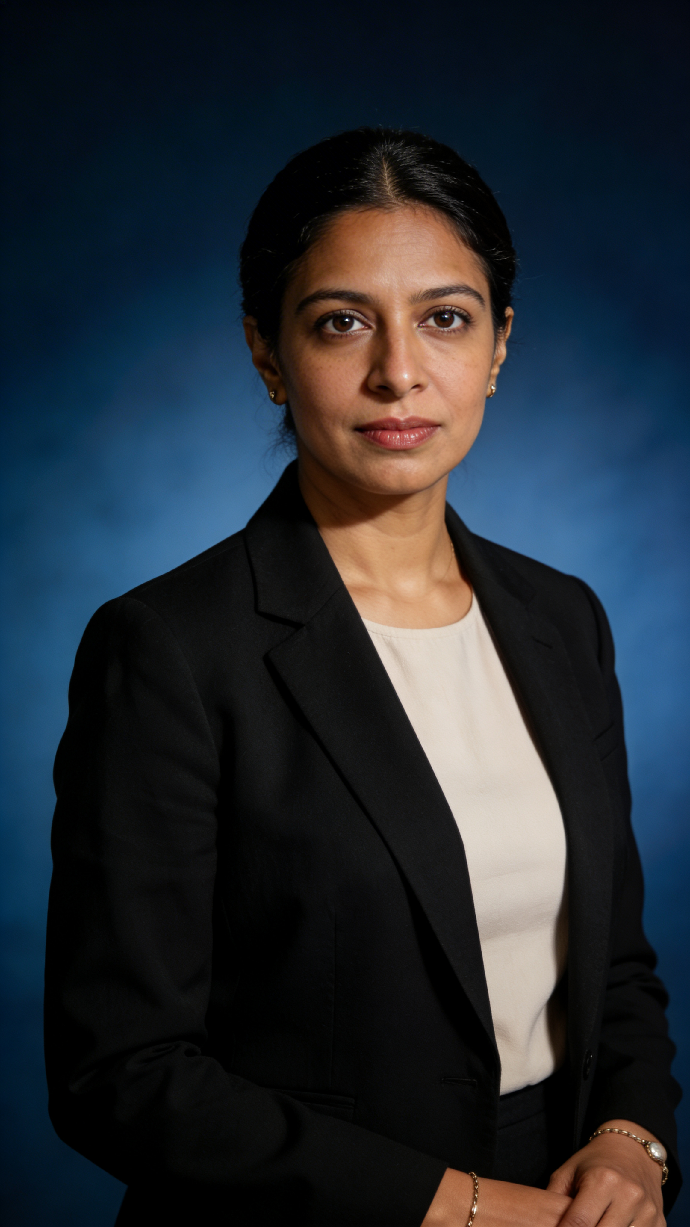 Studio headshot of a South Asian woman attorney in her late 30s wearing a black blazer and light top, hair neatly styled, minimal jewelry. Expression: calm, credible, partner-ready. Background: deep blue seamless with subtle gradient. Lighting: classic portrait setup with soft key and hair light, sharp eyes, natural skin texture. No props or text elements. No captions, no writing, no text, no watermarks, no logos, no overlays