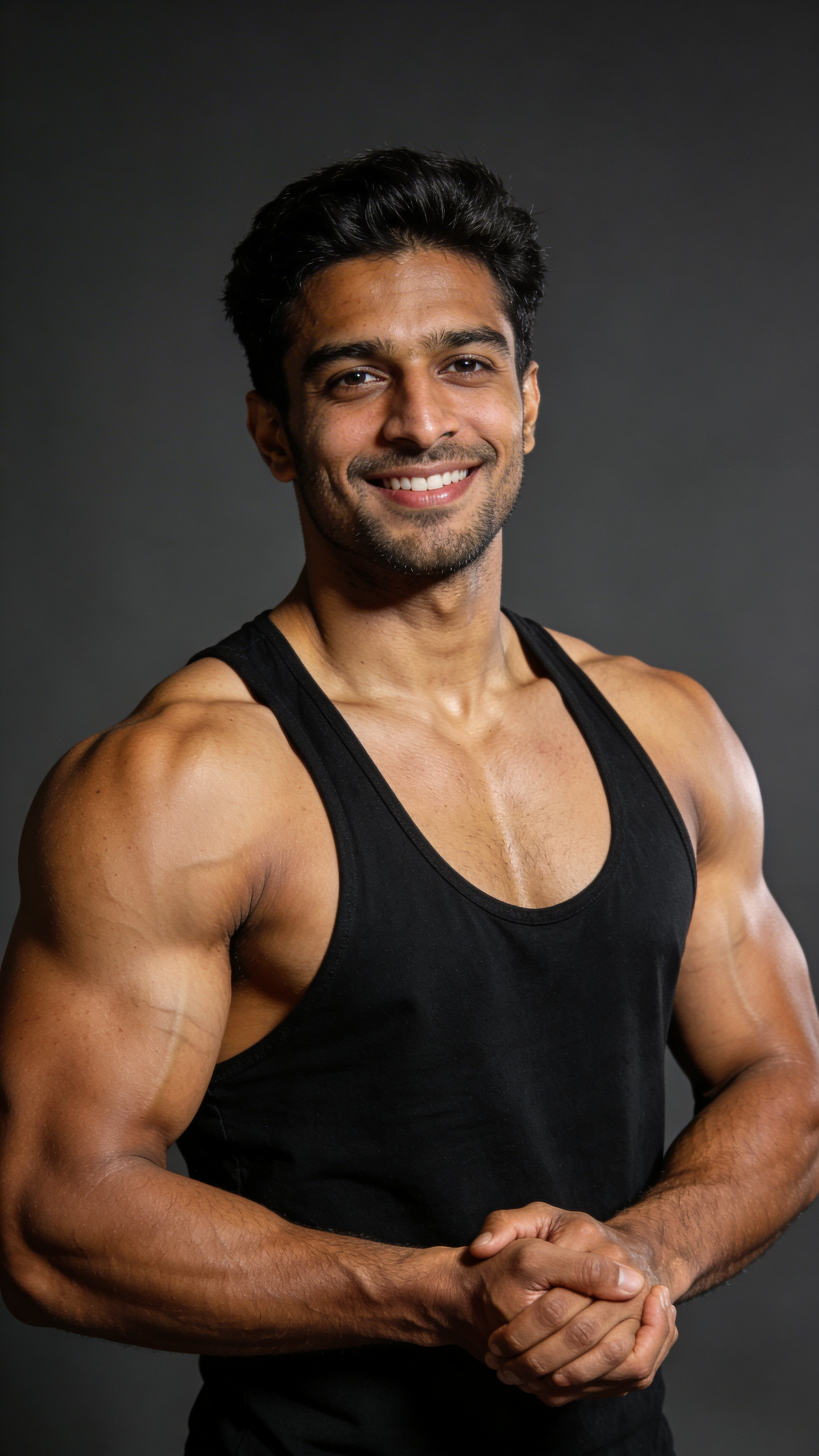 A South Asian male bodybuilder in a professional studio, half-body close portrait emphasizing shoulders, chest, and arms. Pose: relaxed with hands clasped loosely, confident smile. Clothing: plain black stringer tank, no logo. Lighting: softbox key and rim light for deltoid separation, realistic skin texture. Background: dark gray seamless. Clean photo that suits men’s bodybuilding pictures and coaching profiles. No captions, no writing; no text, no watermarks, no logos, no overlays