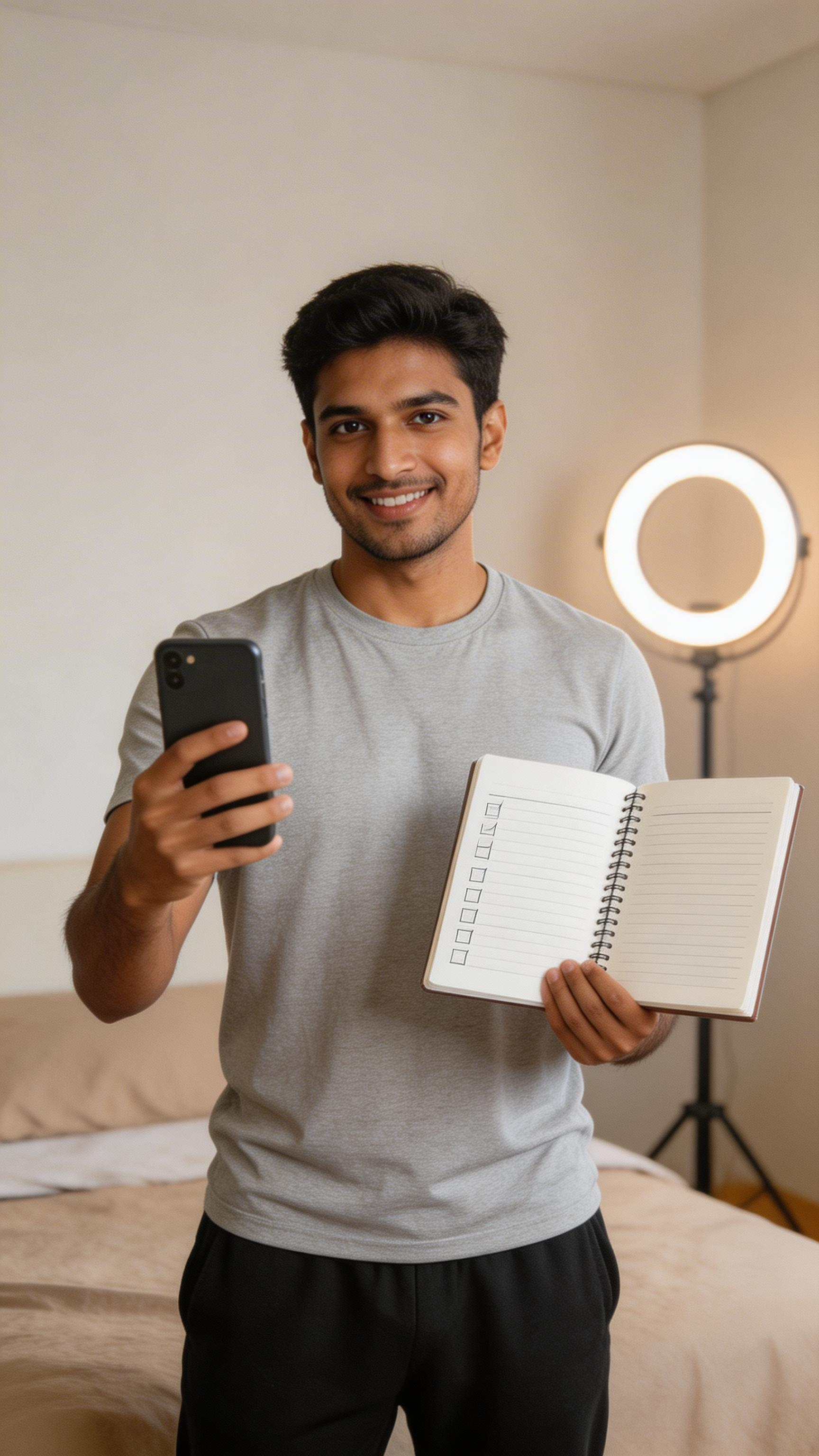 Environmental portrait of a South Asian man in his late-20s filming a “day 1 of 30” challenge clip, standing in a minimalist bedroom with a checklist notebook in hand. Outfit: athletic tee and joggers. Expression: motivated, direct-to-camera. Background: clean room, ring light glow, professional creator lighting. no captions, no writing, no text, no watermarks, no logos, no overlays