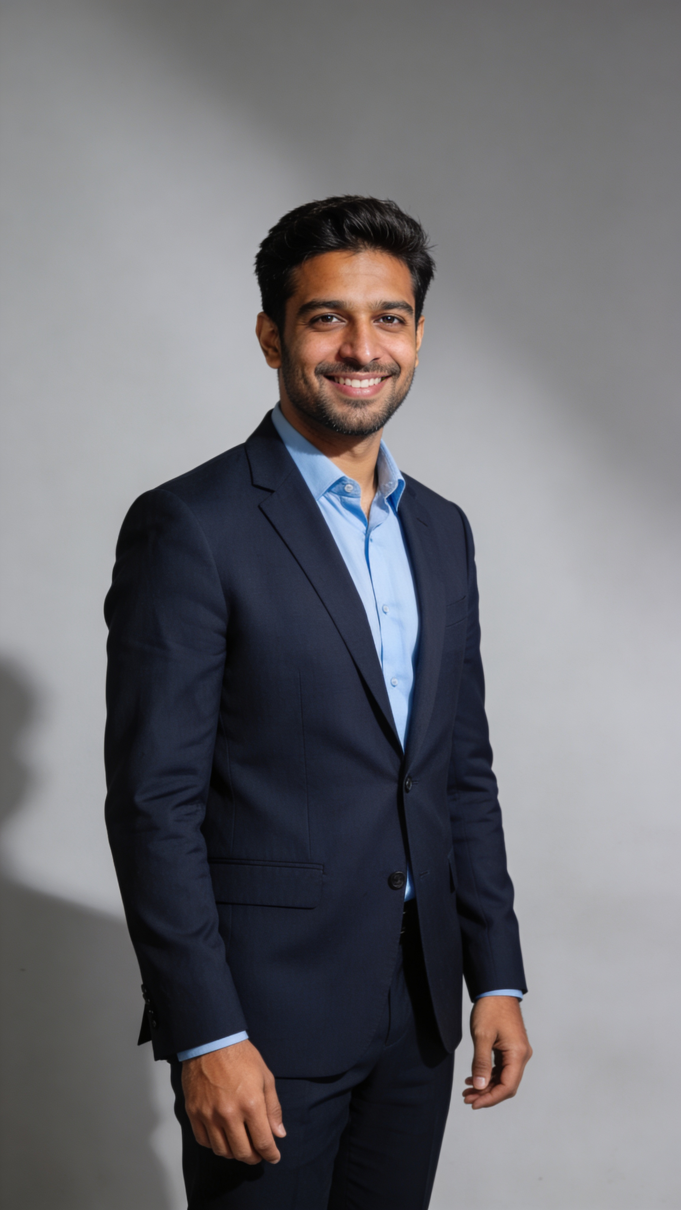 Studio 3/4 portrait of a South Asian man in his mid-30s standing with relaxed posture, hands loosely at sides, friendly confident expression. Wearing a navy suit and light-blue shirt. Medium-gray background, soft key light with subtle shadow shaping, crisp professional look. No visible writing elements; no text, no watermarks, no logos, no overlays