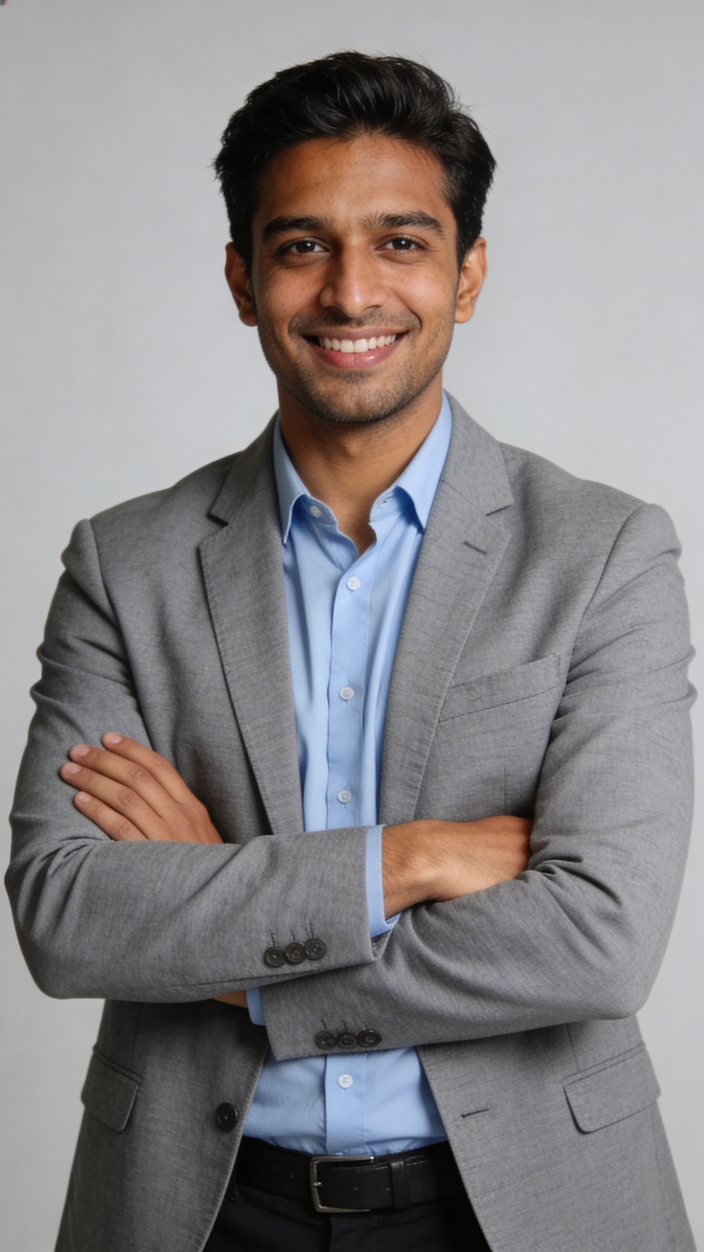 Studio half-body portrait of a South Asian man in his 30s wearing a light blue shirt and gray blazer, arms loosely crossed, confident friendly expression. Background: seamless light-gray backdrop. Lighting: classic portrait softbox with subtle rim; no captions or writing; no text, no watermarks, no logos, no overlays