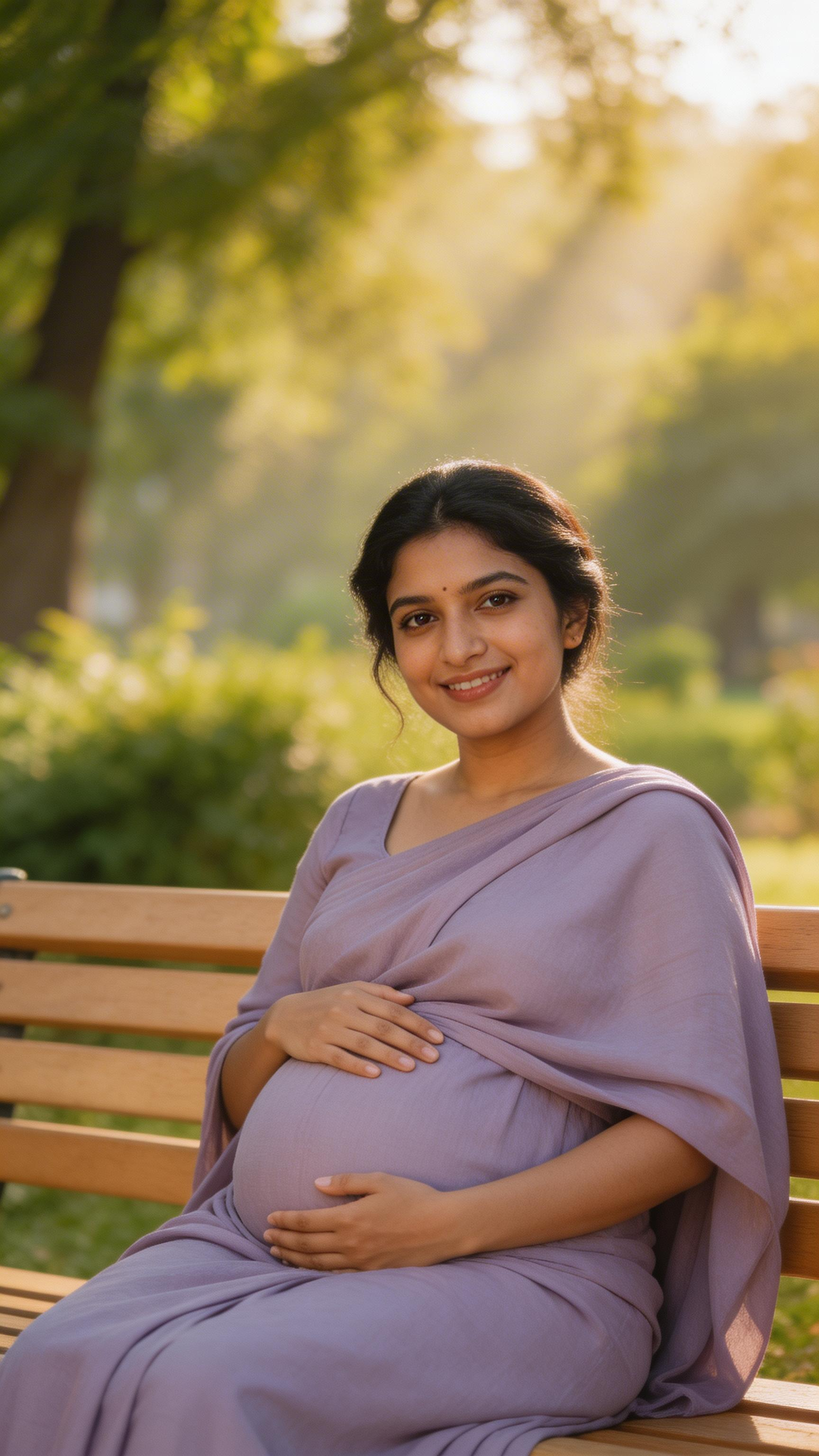 Outdoor environmental portrait of a South Asian pregnant woman sitting on a bench, relaxed smile, wearing a soft lavender sari-style maternity wrap. She looks toward camera, hands on belly. Early morning light, greenery background, professional lifestyle maternity photo; no captions, no writing; no text, no watermarks, no logos, no overlays