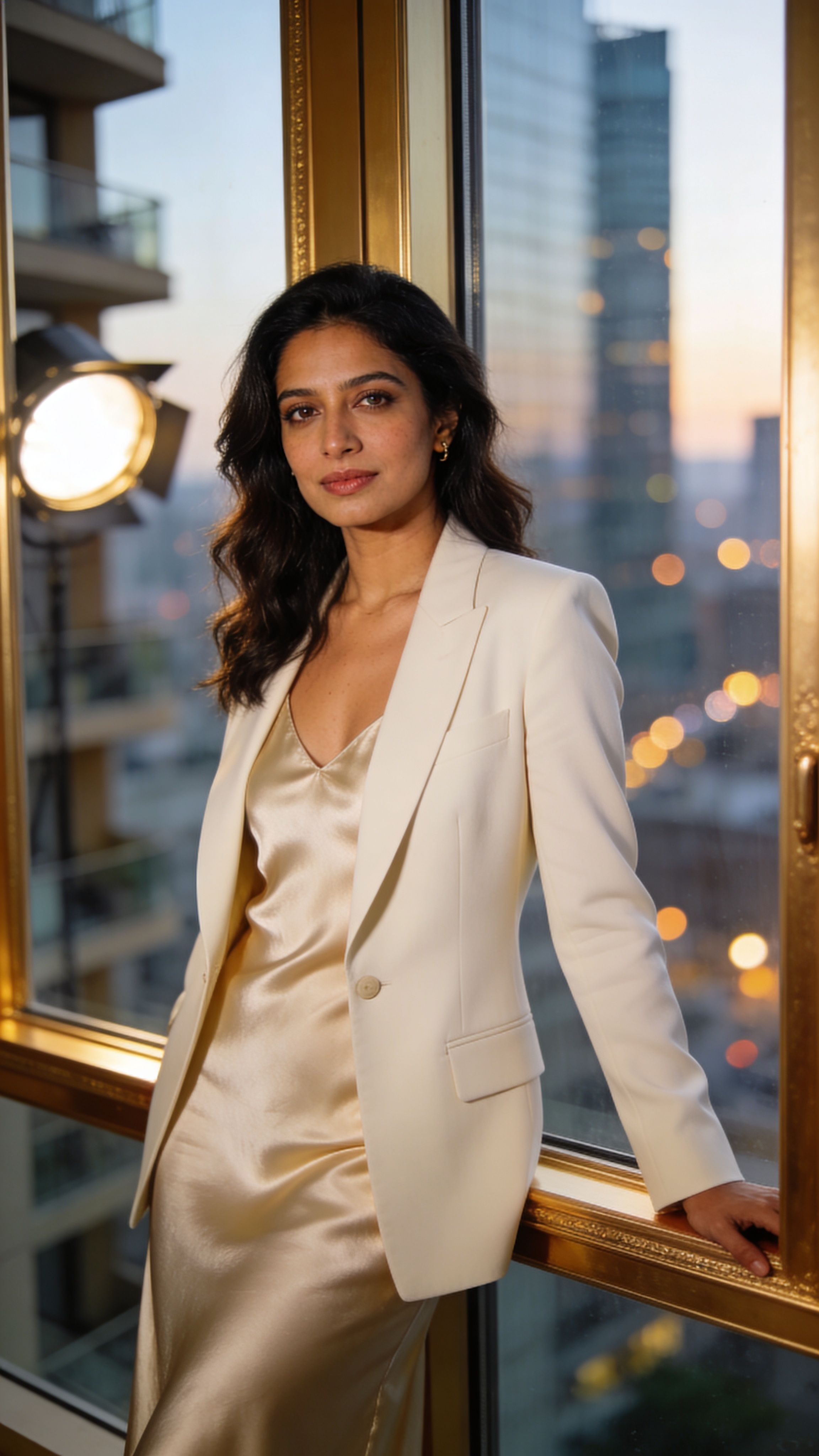 Luxury apartment window portrait of a South Asian woman in her 30s wearing a satin slip dress under a structured blazer (fully covered and elegant). Half-body shot, leaning lightly on a window frame, calm confident expression. Soft window light with a reflector fill; city view bokeh behind for classy glamour photos. No captions, no writing, no text elements anywhere, no text, no watermarks, no logos, no overlays