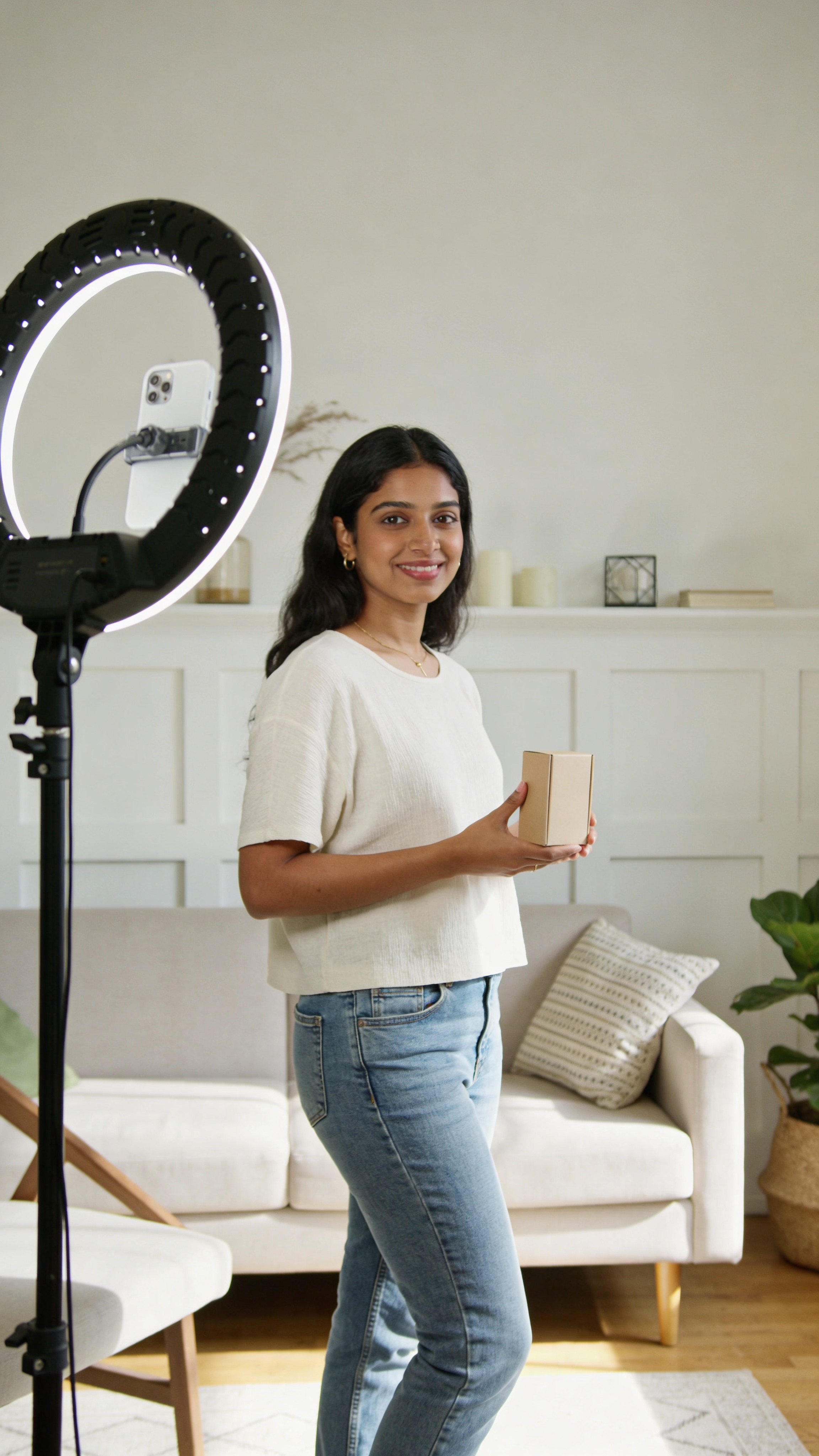Full-body lifestyle photo of a South Asian woman, mid 20s, standing in a bright living room beside a neutral backdrop and ring light, holding a small product box with no readable text. Outfit: simple top and jeans, clean styling. Expression: approachable and confident, perfect for social media content creator photos from home, no captions, no writing, no text, no watermarks, no logos, no overlays