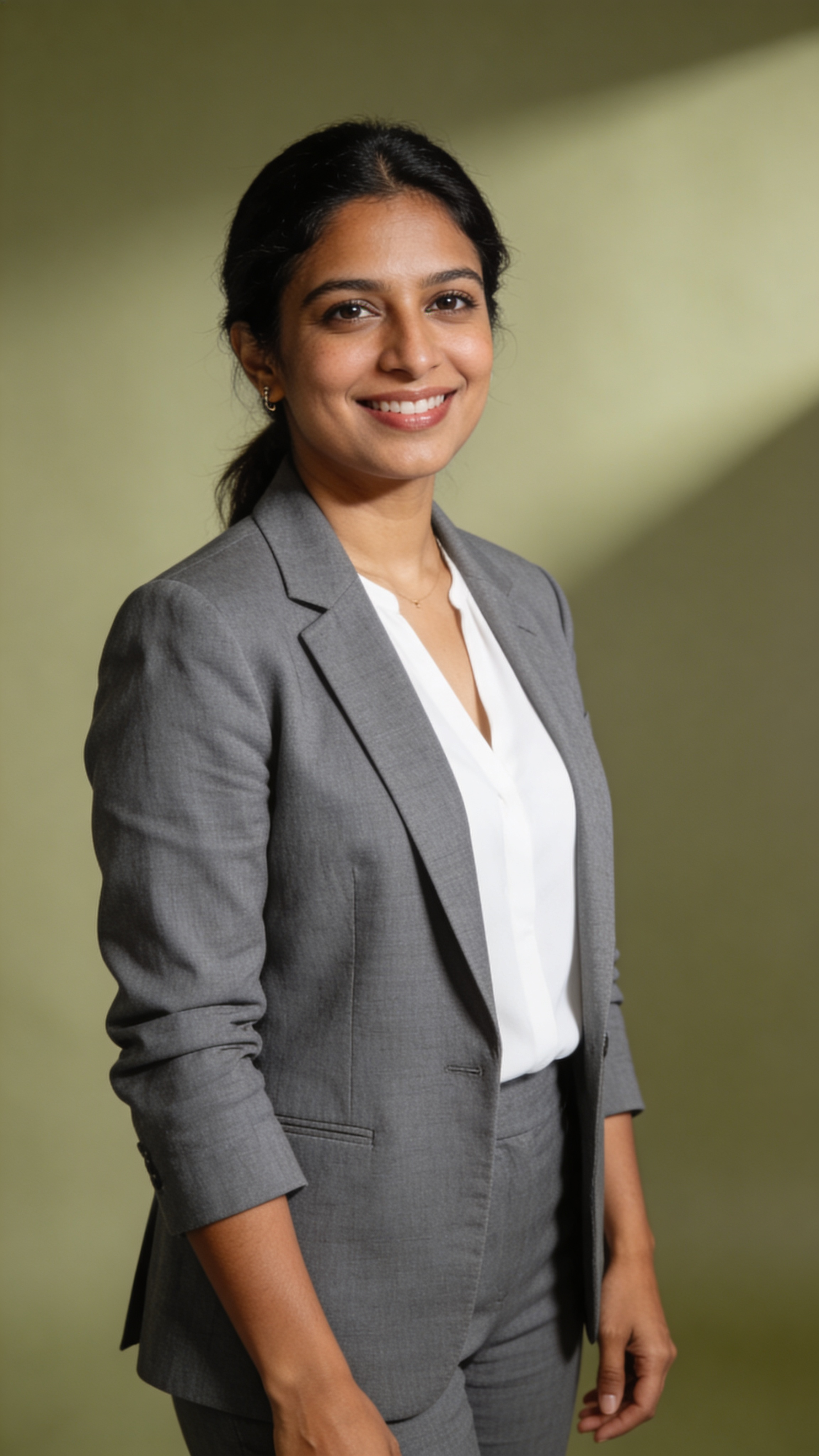 Half-body portrait of a South Asian woman in her late 30s wearing a gray blazer and white blouse, standing in a clean studio with muted olive background. The person smiles professionally, arms relaxed, confident posture. Softbox lighting with subtle shadow depth produces a premium photo for resume without photographer stress feel. No captions or writing; no text, no watermarks, no logos, no overlays.