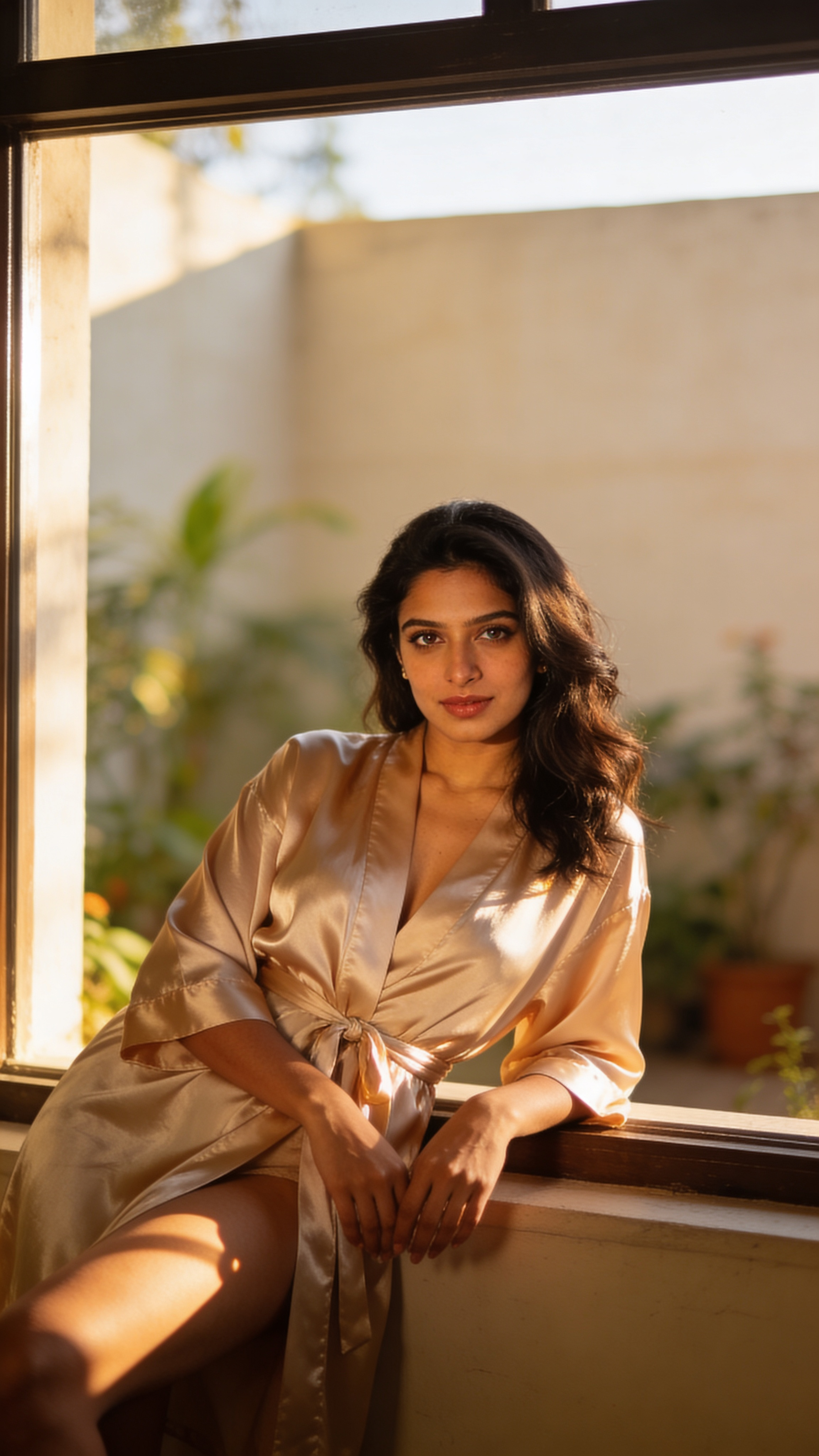Professional boudoir portrait of a South Asian woman, half-body shot, leaning on a windowsill with a satin robe loosely tied, styled classy. Expression is bright and confident, eyes to camera. Background shows soft bokeh of indoor plants and a neutral wall. Golden hour light creates warm highlights and a soft glow on skin. no captions, no writing, no text, no watermarks, no logos, no overlays