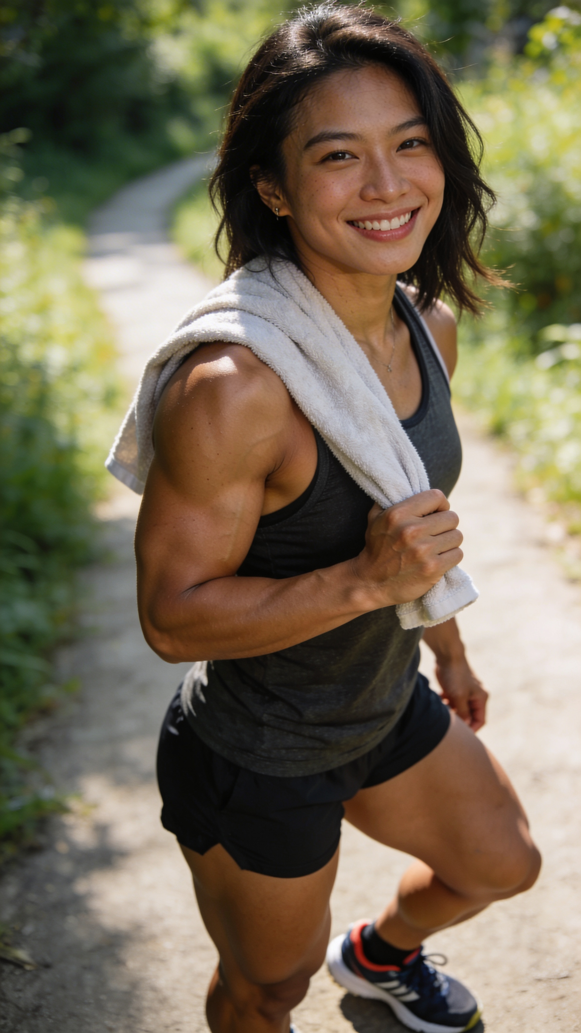 3/4 body outdoor trail portrait of a Southeast Asian woman bodybuilder, mid 20s, holding a gym towel over shoulder, smiling after training. Outfit: tank top, shorts, running shoes. Lighting: bright natural daylight with soft fill. Background: green trail blurred, fresh and energetic while still bodybuilding-focused, no captions, no writing, no text, no watermarks, no logos, no overlays