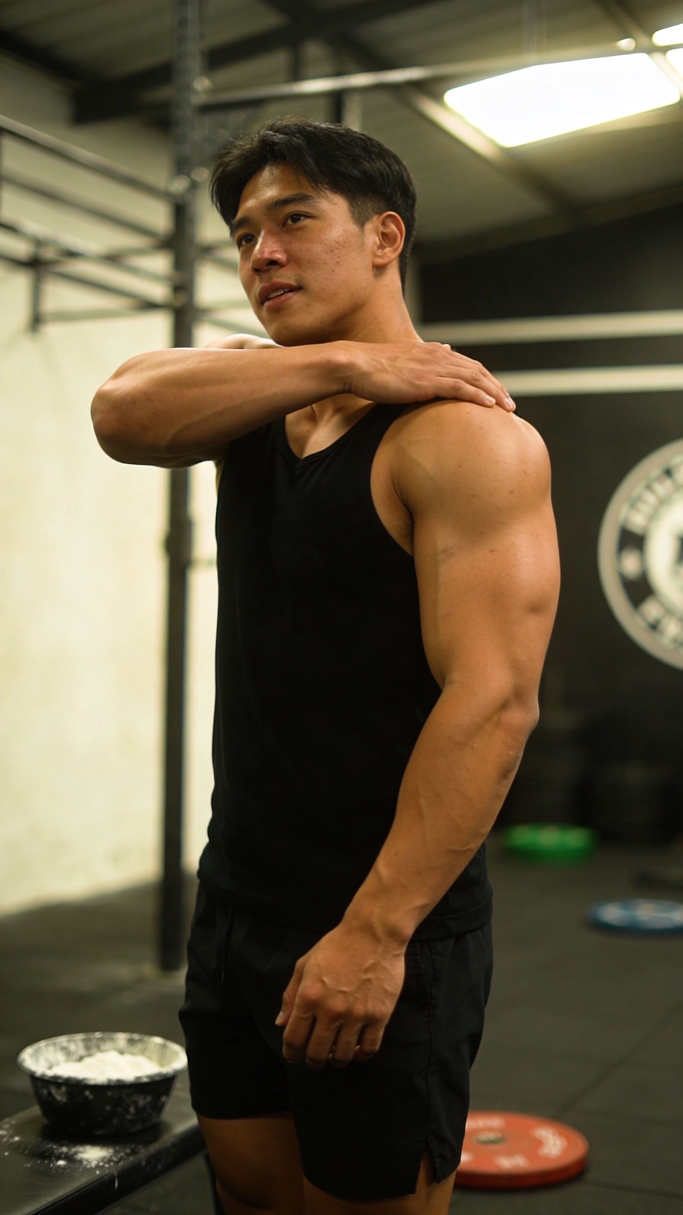 A Southeast Asian male bodybuilder in a gritty-but-clean gym corner, half-body portrait mid-warmup stretching shoulders. Clothing: plain black tank and shorts. Expression: relaxed and focused. Lighting: directional overhead with soft fill to avoid harsh shine, showing deltoid roundness and arm vascularity naturally. Background: blurred chalk bowl and plates, no logos. No captions, no writing; no text, no watermarks, no logos, no overlays