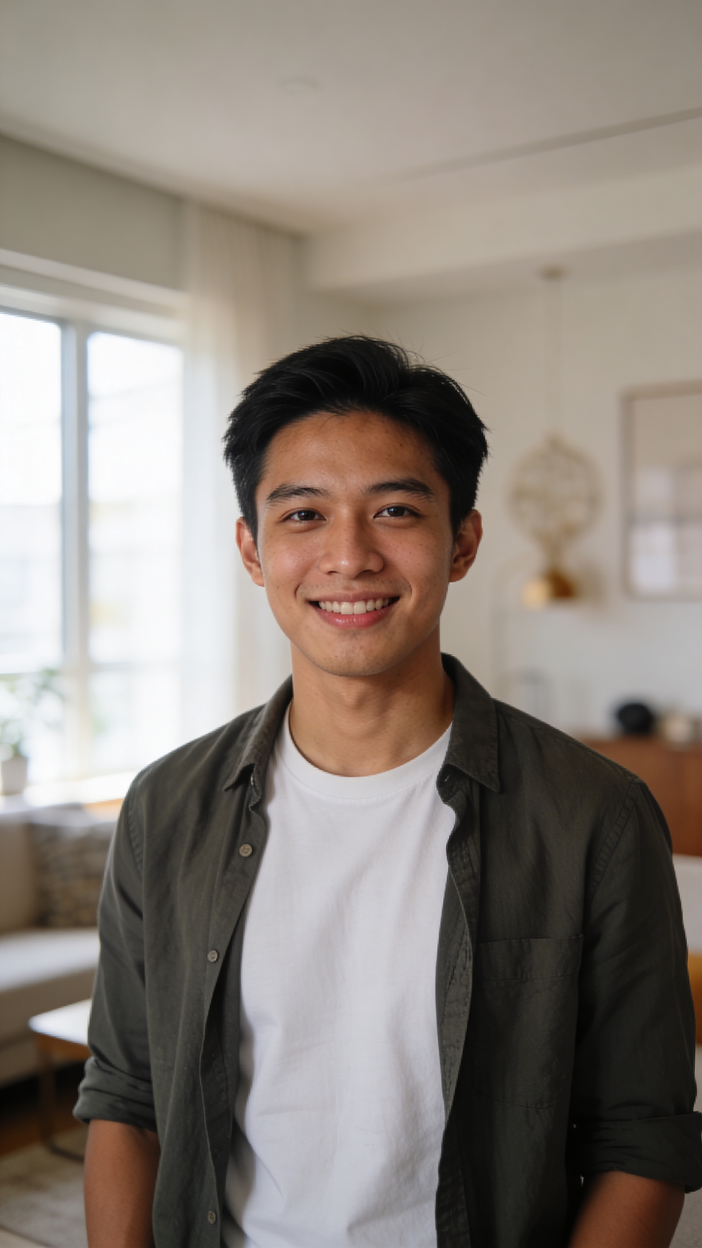 Professional portrait of a Southeast Asian man in his late 20s, half-body shot in a modern apartment living room. He wears a clean fitted t-shirt and overshirt, expression friendly and confident. Natural window light with soft fill, realistic detail. Background includes tasteful decor blurred for a DIY profile picture from home vibe, no text, no watermarks, no logos, no overlays