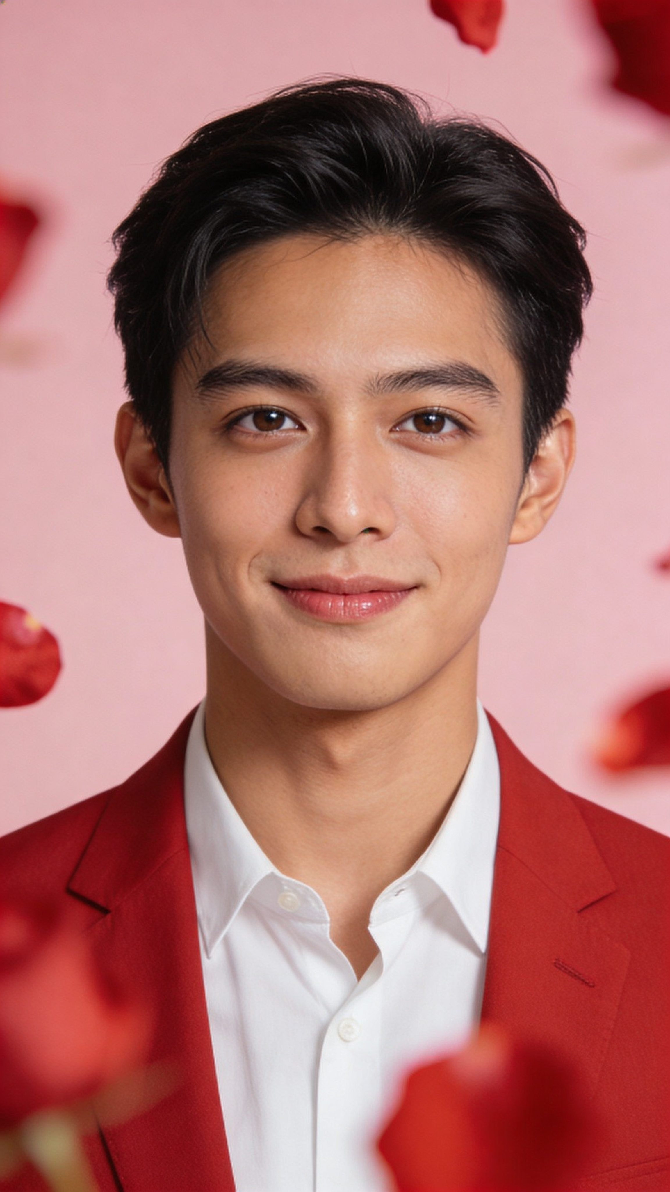 Professional headshot of a Southeast Asian man in his late 20s, smiling calmly, shoulders squared. Outfit: white shirt with red blazer. Setting: studio with soft pink background and subtle red rose petals blurred in foreground bokeh. Lighting: beauty dish with catchlights, clean skin texture. Valentines theme, no captions, no writing, no text, no watermarks, no logos, no overlays