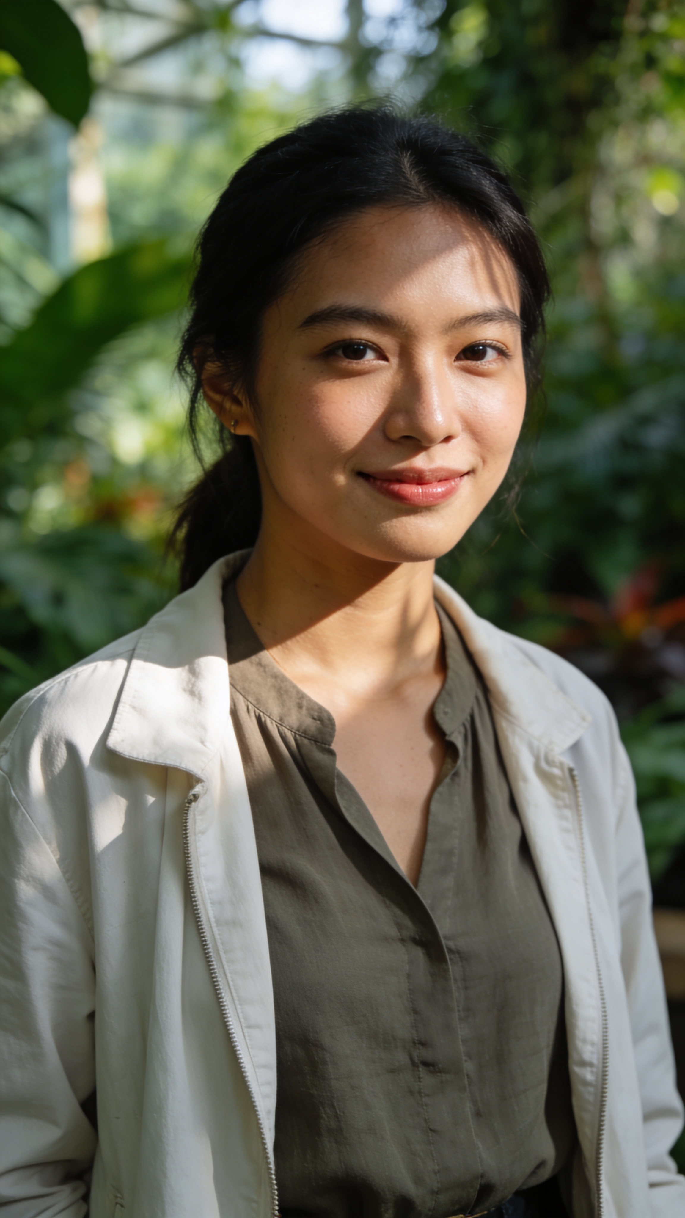 Professional outdoor portrait of a Southeast Asian woman in her late 20s, half-body shot in a botanical garden. She wears a simple blouse and light jacket, expression calm and friendly. Soft diffused daylight, rich natural colors, background greenery blurred. Clean framing designed for a profile picture for work and social, no text, no watermarks, no logos, no overlays