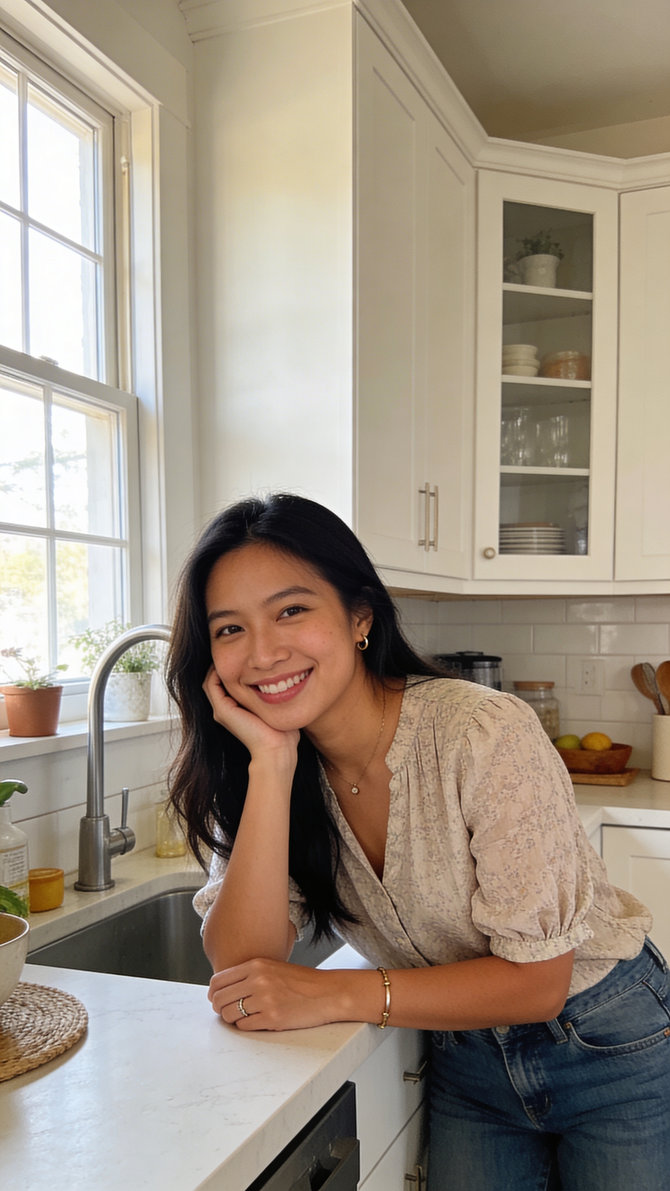 Environmental portrait of a Southeast Asian woman in her early 30s in a bright kitchen, half-body, leaning lightly on counter, friendly smile. She wears a modest blouse and jeans, minimal jewelry. Background: soft, clean home details. Window light creates a warm, approachable portrait feel—DIY but professional. No captions or writing; no text, no watermarks, no logos, no overlays