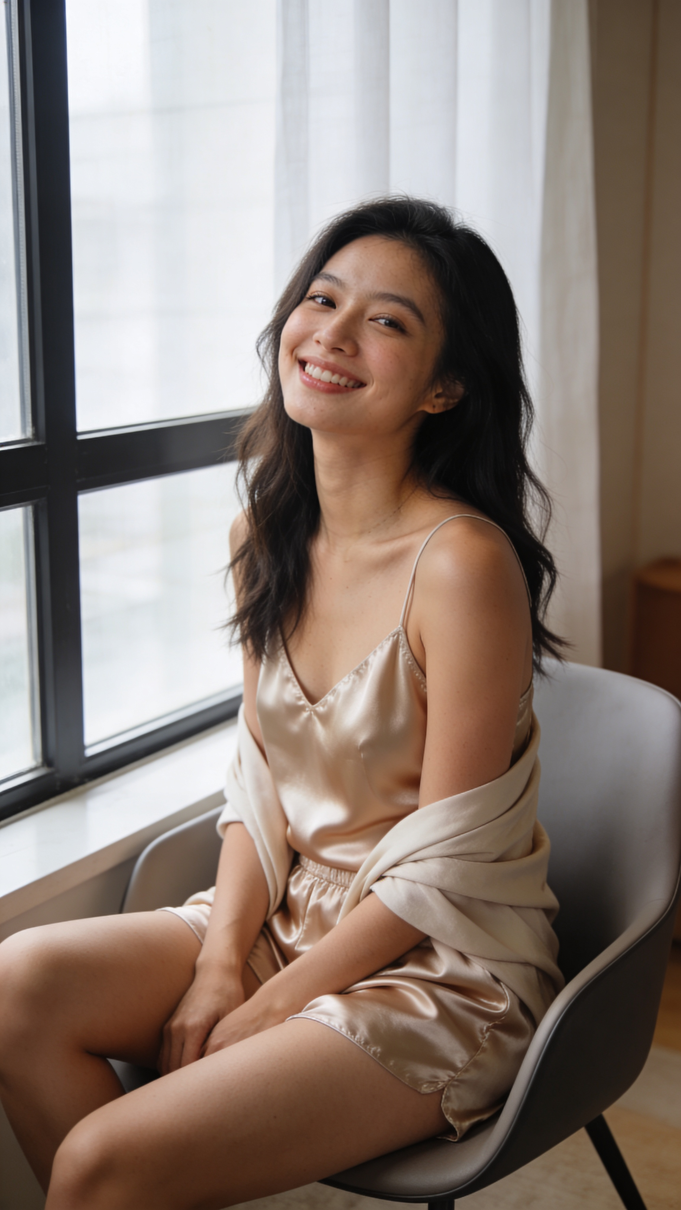 Three-quarter lifestyle portrait of a Southeast Asian woman in her late 20s sitting on a modern chair by a large window, wearing a satin camisole and matching shorts with a soft wrap (tasteful). Expression: relaxed, happy. Soft daylight, minimalist decor, professional lingerie portraits feel for at-home creation. No captions, no writing, no text, no watermarks, no logos, no overlays