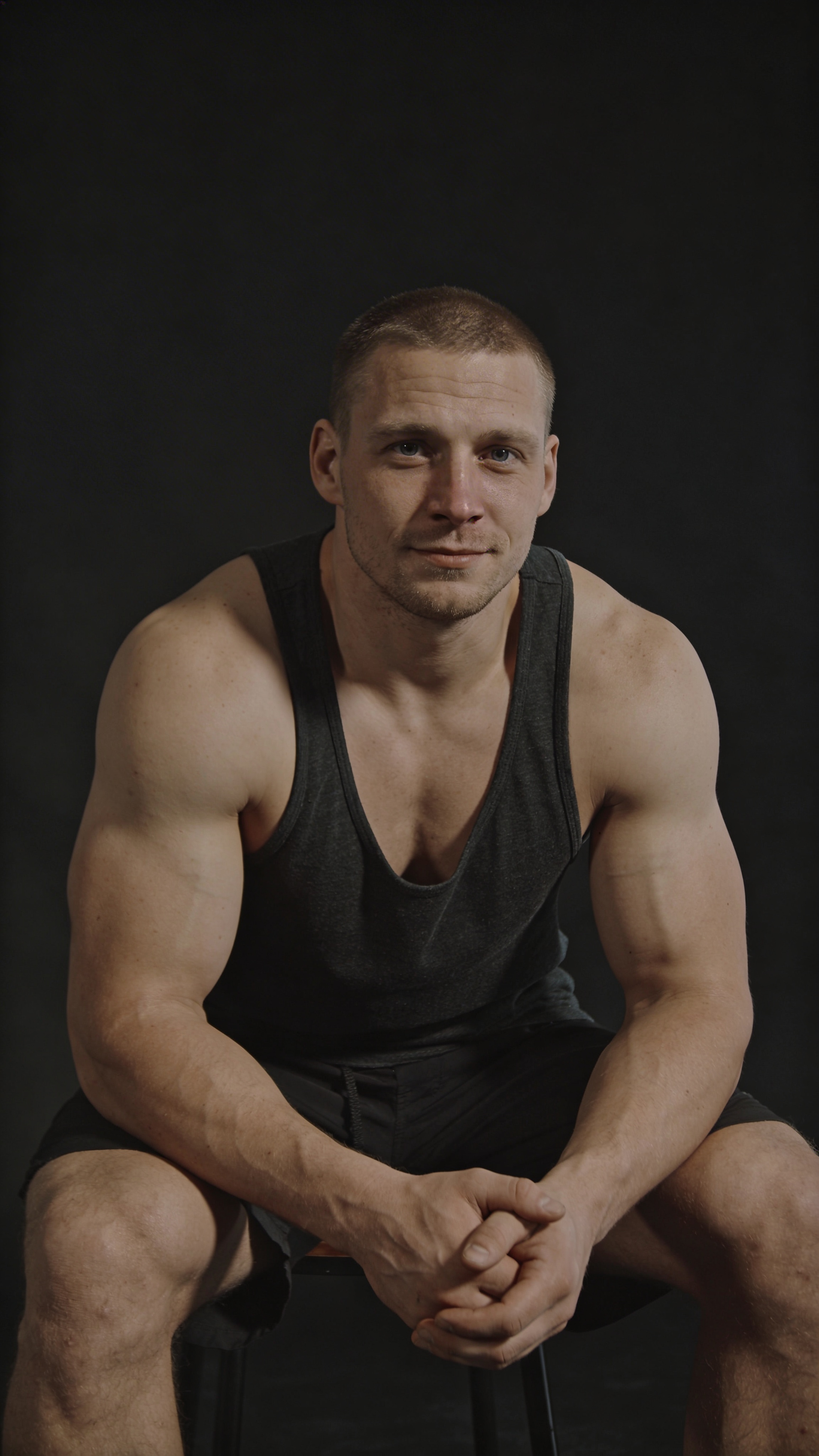 A Caucasian/White male bodybuilder, half-body portrait seated on a stool. Pose: elbows on knees, hands clasped, confident calm look. Clothing: plain dark tank top and shorts. Lighting: cinematic single key light with soft fill, emphasizing traps and upper chest. Background: dark studio with clean negative space. Perfect for bodybuilder physique photos for Instagram avatars and posts. No captions, no writing; no text, no watermarks, no logos, no overlays