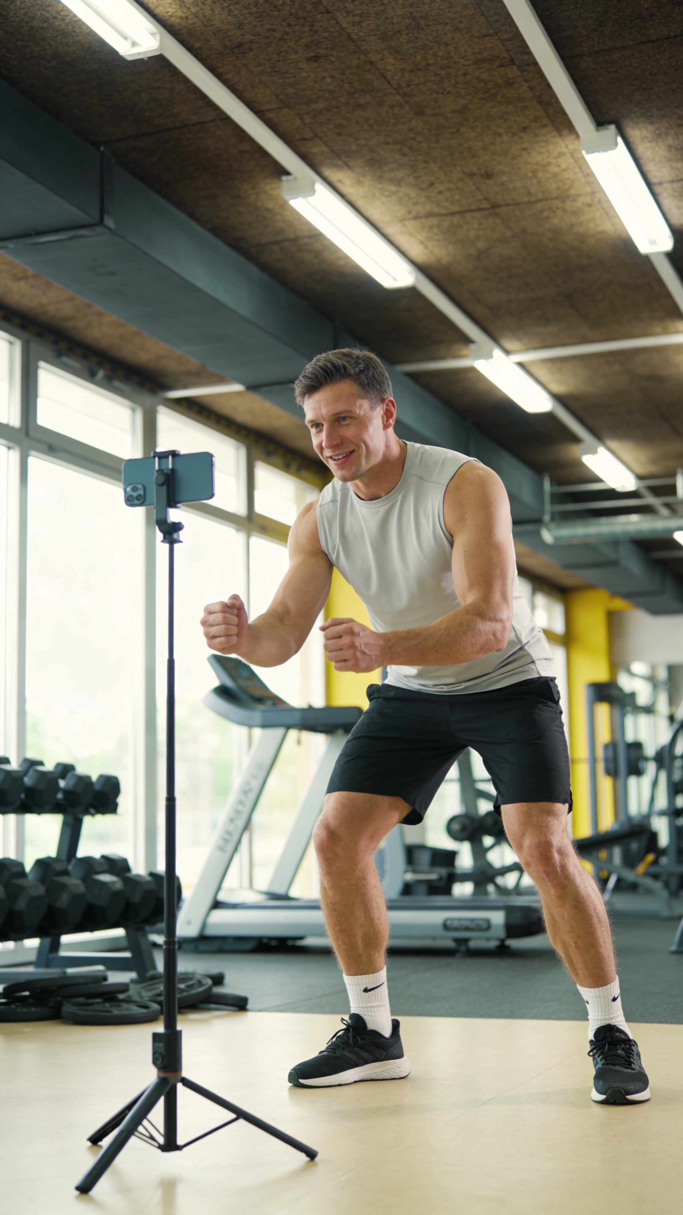 Caucasian/White man mid-30s, athletic build, full-body shot in a gym, demonstrating a simple pose beside a phone tripod, as if filming a short workout clip for IG Reels. Expression: focused and approachable. Outfit: clean athletic wear, bright overhead lights with controlled contrast. Professional sports photography, no text, no watermarks, no logos, no overlays