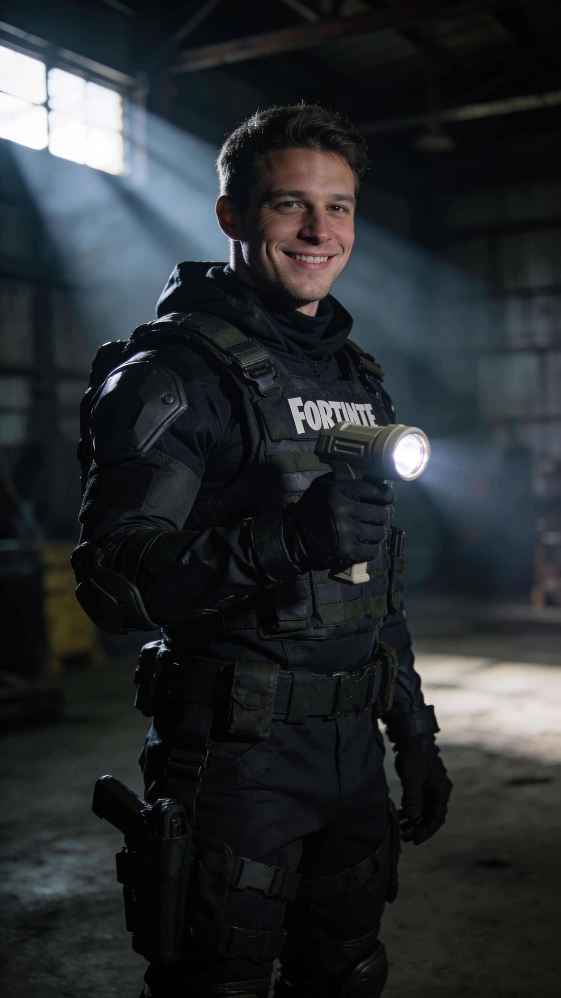 Half-body portrait of a Caucasian/White man in a Fortnite-inspired stealth commando cosplay, standing in a dim warehouse set with dramatic light beams. He holds a neutral prop flashlight, friendly confident half-smile. Cinematic low-key lighting, shallow depth of field, professional portrait photography. No captions, no writing, no text, no watermarks, no logos, no overlays