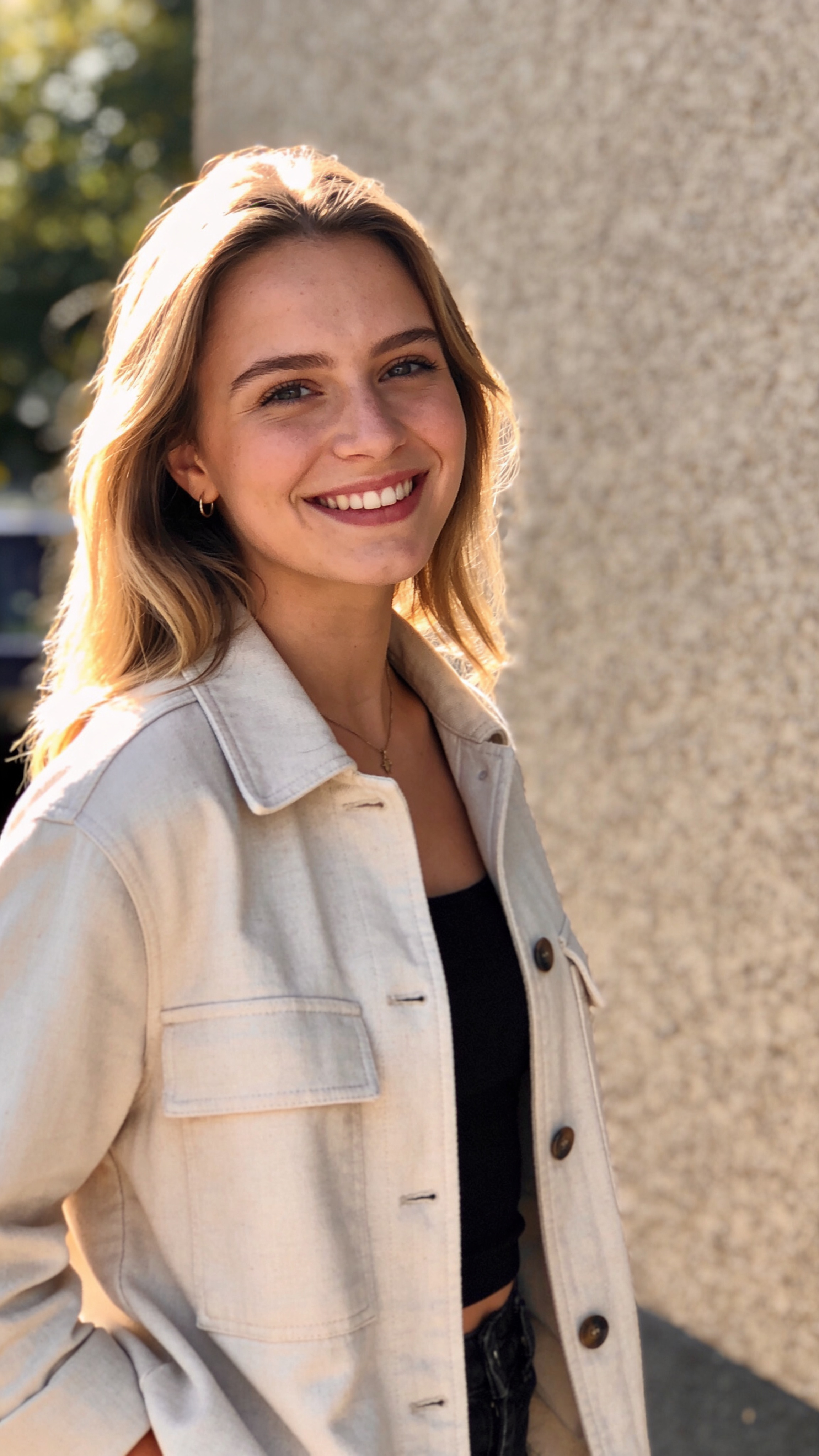 Professional lifestyle portrait of a Caucasian/White woman in her mid-20s, 3/4 body shot standing in front of a simple textured wall with soft sunlight. She wears a casual chic outfit, relaxed posture, bright friendly smile. Natural light creates gentle highlights, background softly blurred, perfect for a profile picture maker for social platforms, no text, no watermarks, no logos, no overlays
