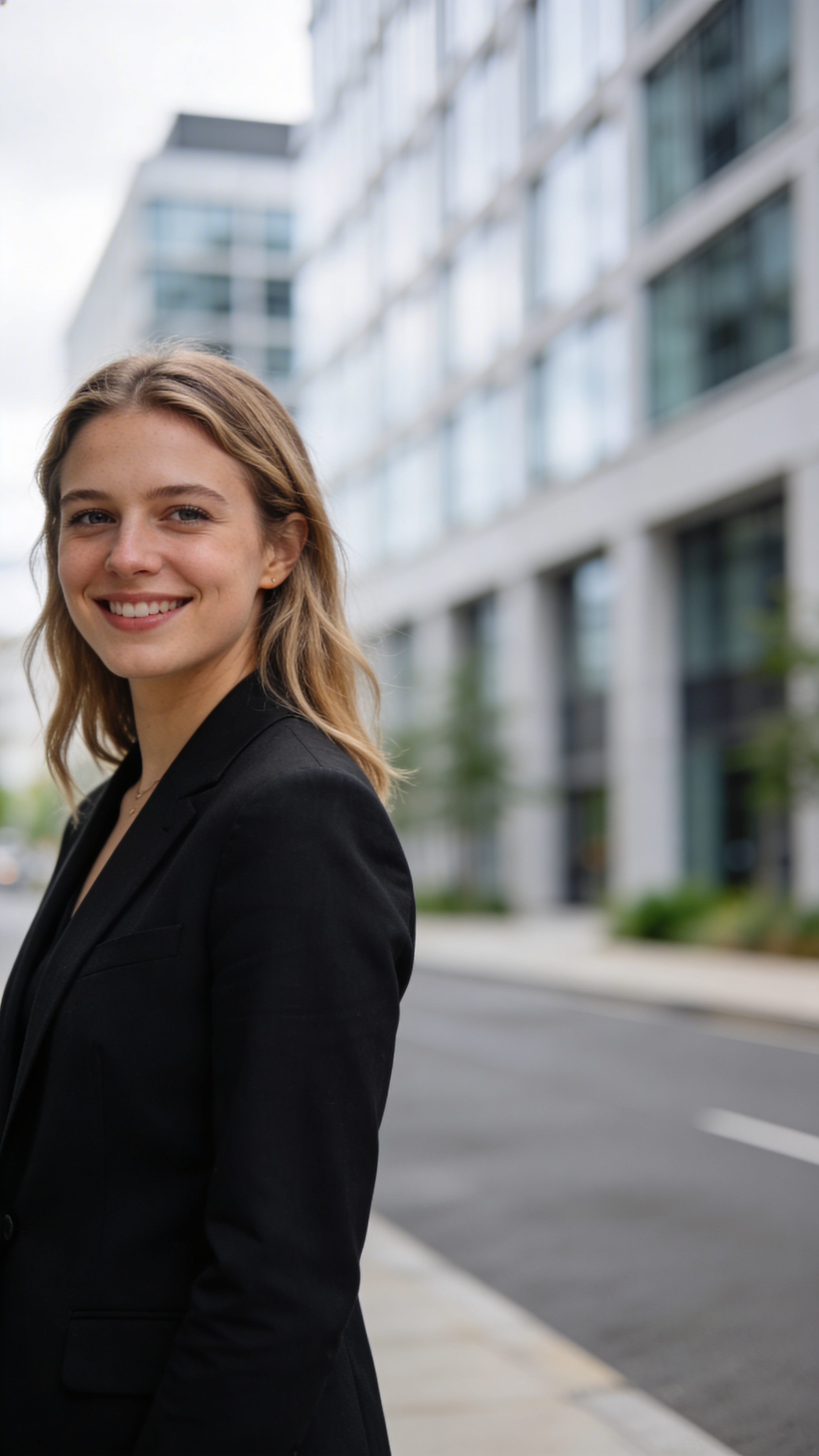 Outdoor lifestyle corporate portrait of a Caucasian/White woman in her late 20s wearing a black blazer, standing near an office district street, looking at camera with confident smile. Background: modern buildings blurred, subtle greenery. Lighting: bright overcast for soft shadows; no captions or writing; no text, no watermarks, no logos, no overlays