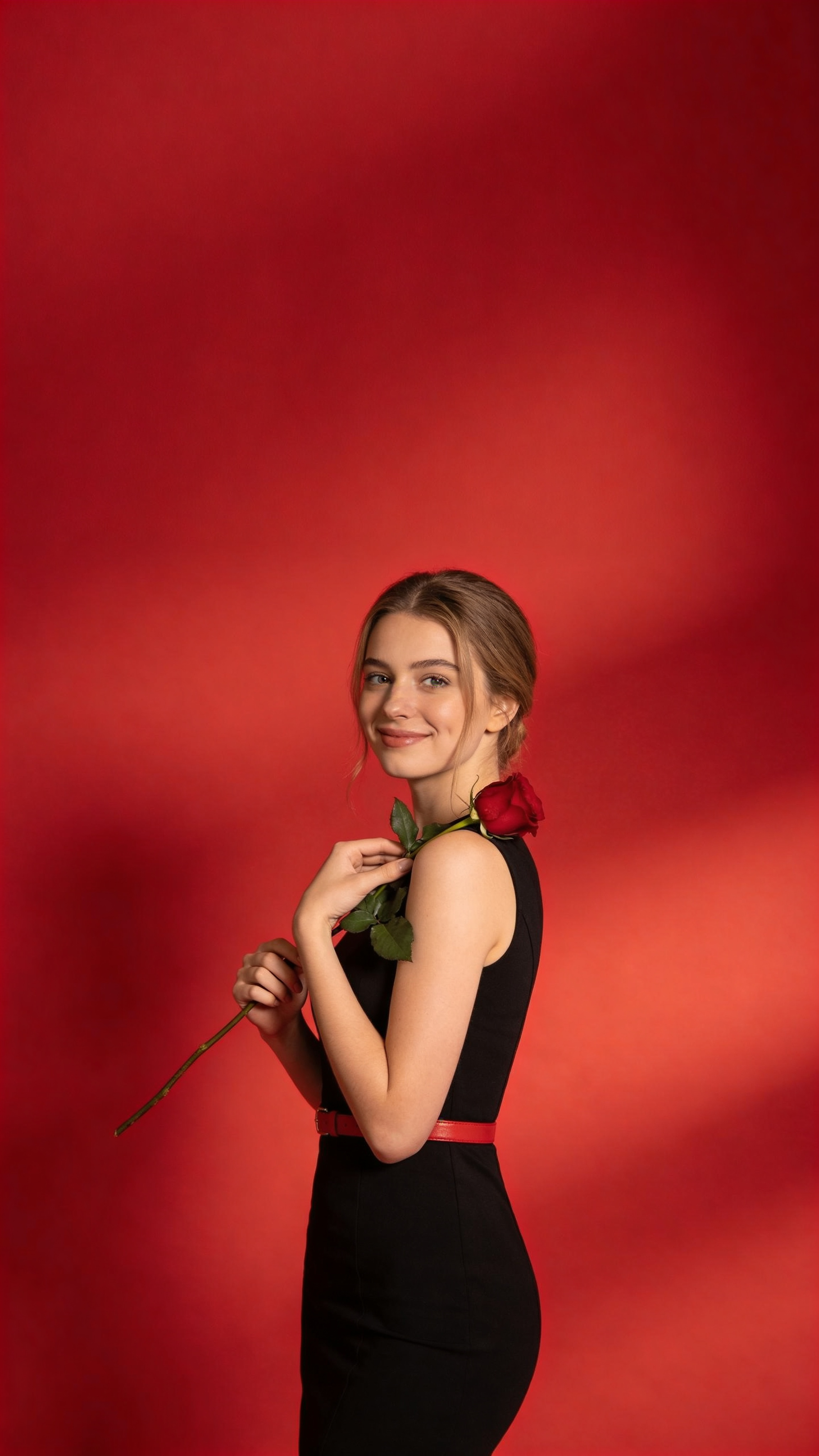 Professional studio 3/4 body portrait of a Caucasian/White woman in her late 20s, standing with a relaxed pose, holding a rose near her shoulder, soft smile. Outfit: fitted black dress with red belt. Background: red seamless with subtle shadow gradient, high-end fashion feel. Lighting: soft key with gentle edge light, sharp yet flattering. Clean composition, no captions, no writing, no text, no watermarks, no logos, no overlays